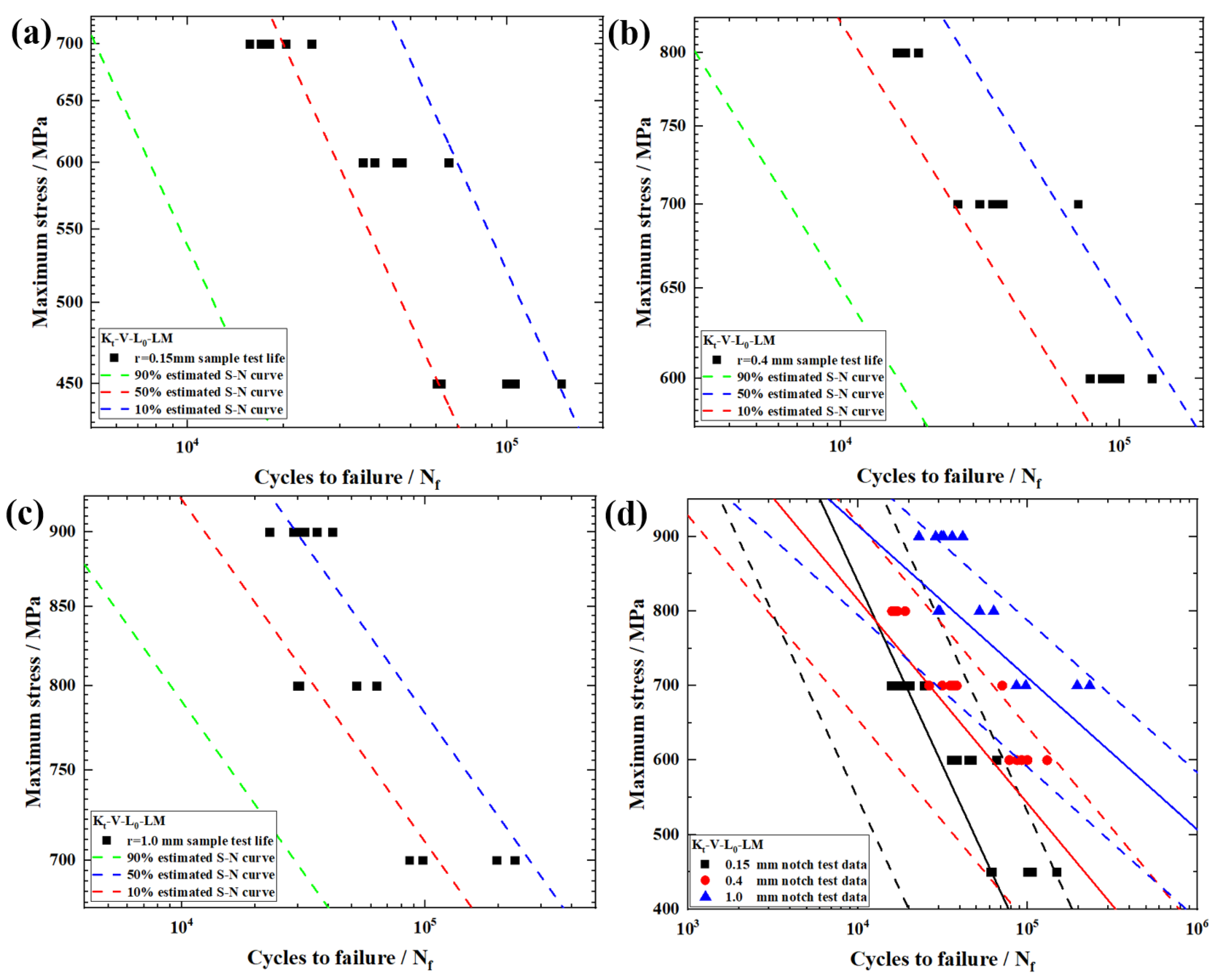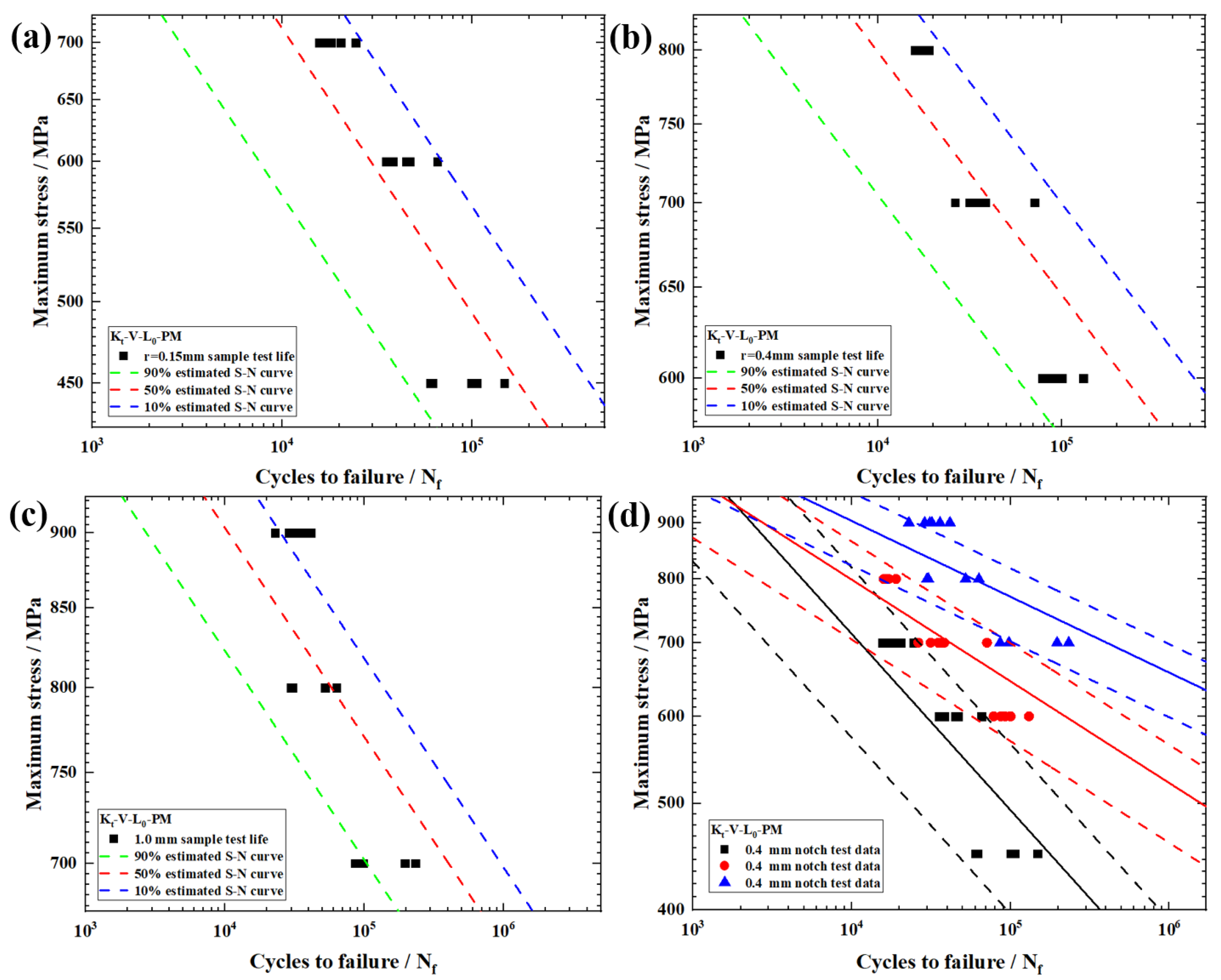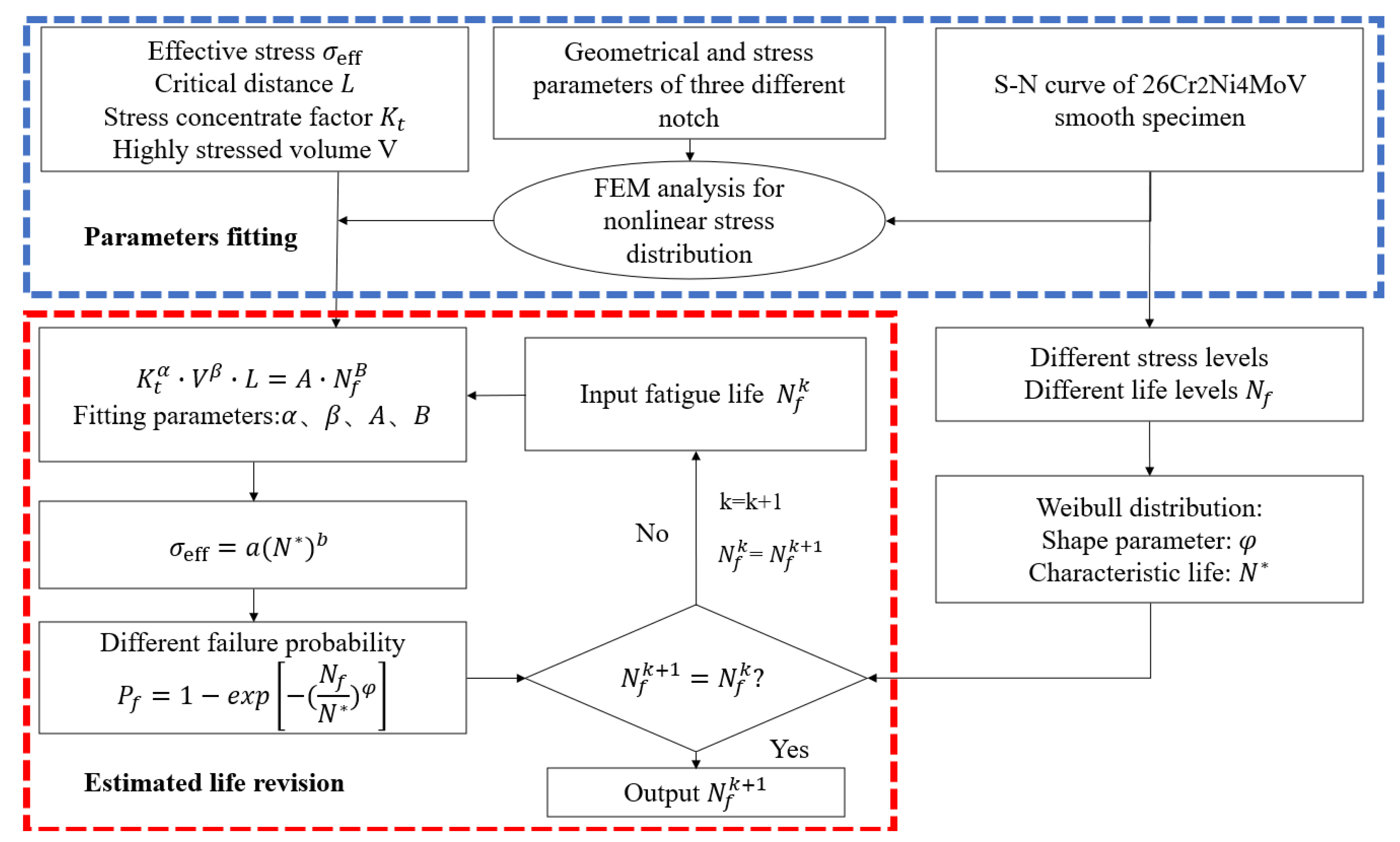 - Based on the fatigue data of smooth and notched specimen, and the FEM analysis for linear stress distribution of different notches. The , are determined by smooth specimen under different stress levels and , , , and can be fitted by the data of highly stressed volume V, stress concentration factor Kt and critical distance L;