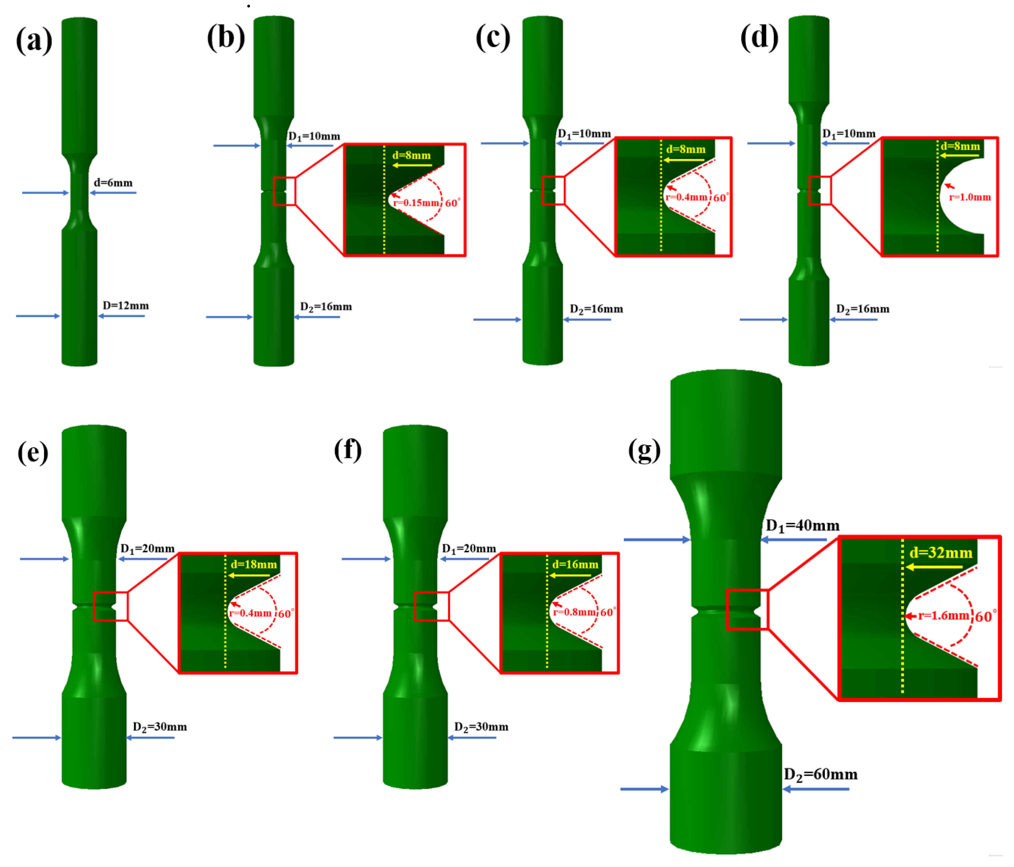 | Specimens Notch Diameter (Root Radius) | /MPa | /MPa | Maximum Stress Reduction Path | ||
