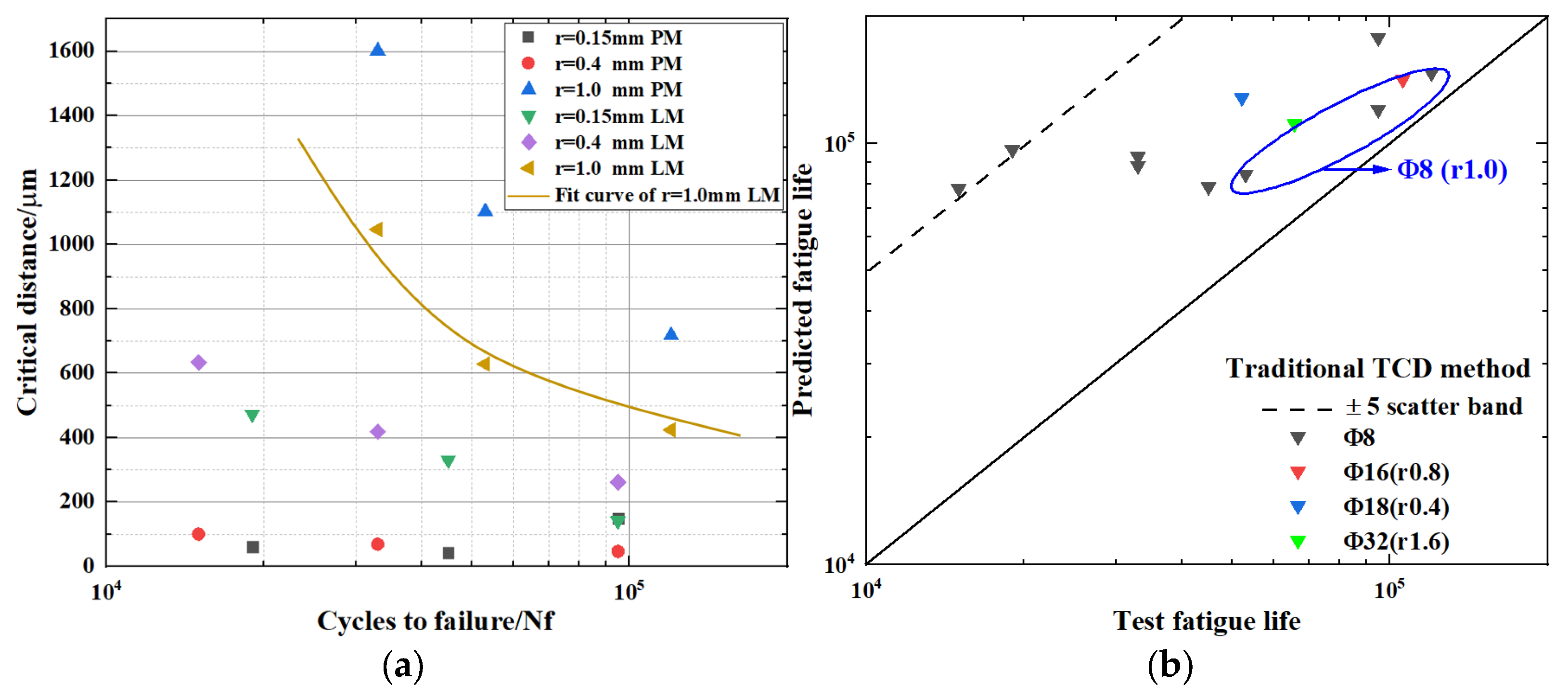 - Zeng, Y.; Li, Z.; Deng, W.; Wang, F.; Wang, Z. A novel line method of the theory of critical distance for predicting the notched specimen’s fatigue life based on the relative stress gradient variation. Appl. Phys. A 2025, 131, 1–15. [Google Scholar] [CrossRef]