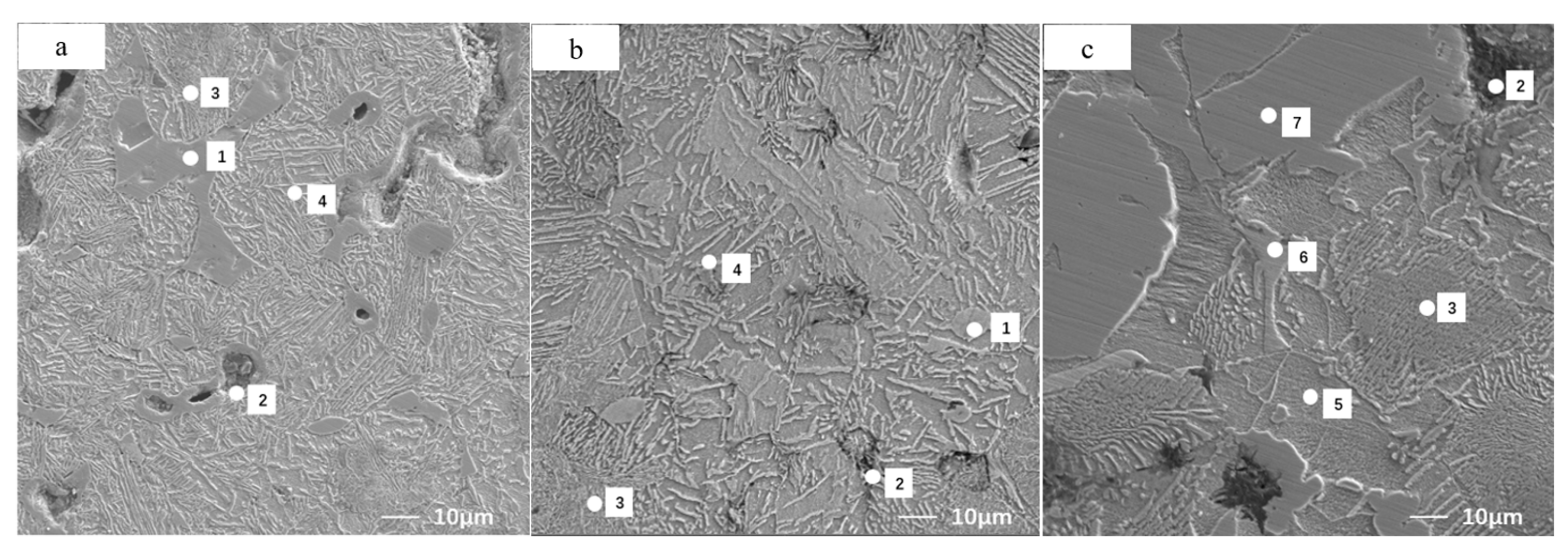 - Regarding the wear mechanisms of the alloys: Alloy 1 (high MoS2, low Cu) undergoes severe abrasive wear, as its coarse MoS2-rich phases and irregular pearlite easily detach during friction to form abrasive particles that scratch the surface, leading to the highest friction coefficient (0.5) and wear loss (2964 μm2). Alloy 2 (low MoS2, low Cu) experiences mild abrasive wear, where reduced MoS2 mitigates but does not eliminate phase coarsening, and low Cu provides limited lubrication, resulting in a moderate friction coefficient (0.3) and wear loss (1580 μm2). Alloy 3 (no Mo, high C-Cu) exhibits mild adhesive wear, with fine pearlite enhancing matrix hardness (145 HB) to resist scratching, Cu acting as a solid lubricant to reduce metal-to-metal contact, and pores (25.14% porosity) storing oil for further lubrication, thus achieving the lowest friction and wear.
