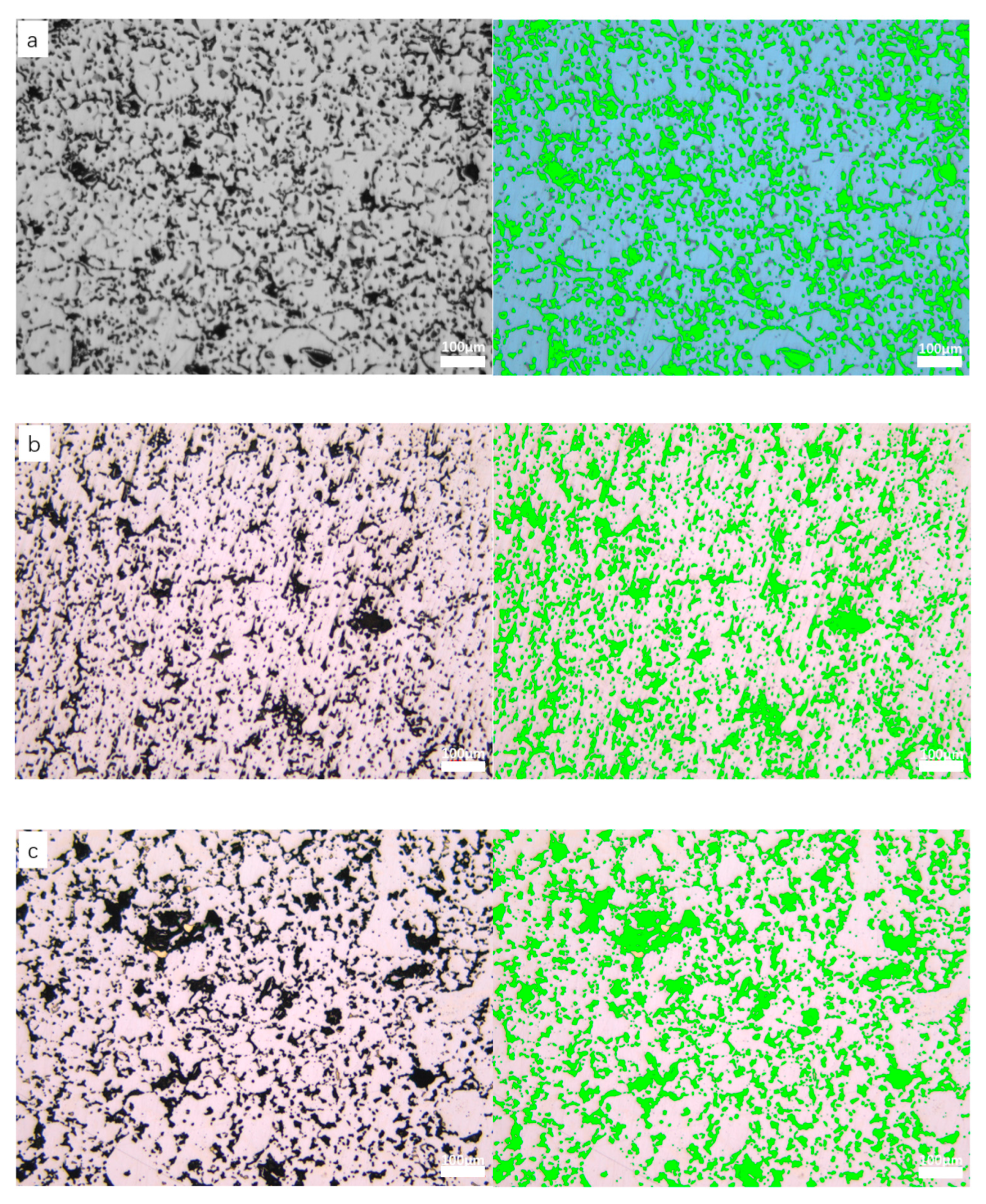 - Based on the current research results, future work can focus on the following aspects: Further exploration of the influence of different alloy elements and their contents on the wear resistance of materials in order to find the best alloy element combination and content so as to maximize the wear resistance of materials. By adjusting the preparation process and heat treatment conditions, such as refining the pearlite layer and controlling the porosity and the distribution of alloy phase, the microstructure of the material can be optimized so as to improve the wear resistance and comprehensive properties of the material. The optimized material can then be applied to actual working conditions for long-term wear resistance testing and performance evaluation in order to verify its feasibility and reliability in practical applications.