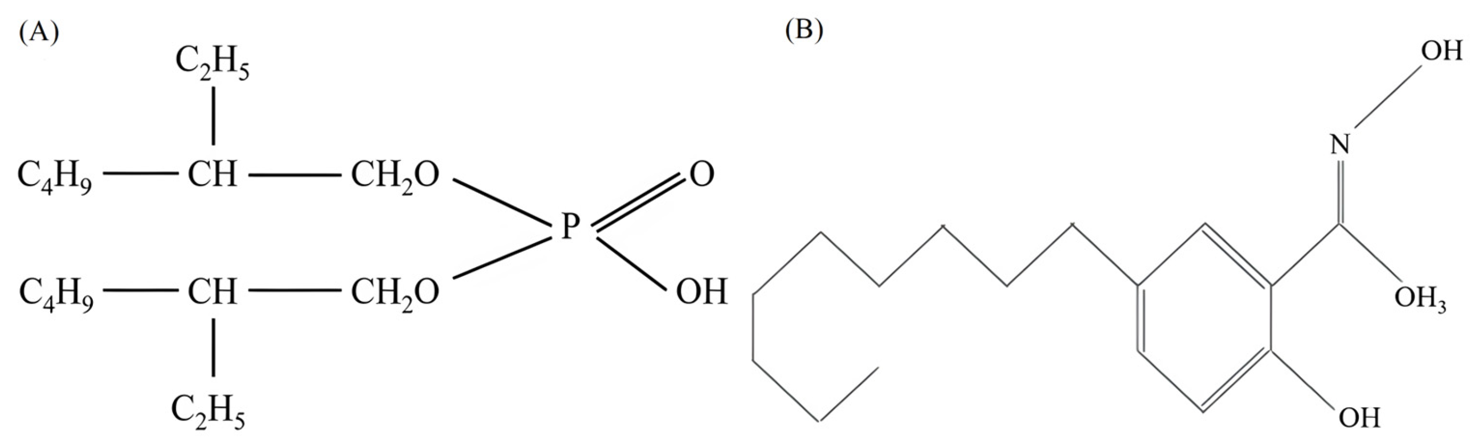 - Prasetyo, E.; Anderson, C. Isolation of Zinc, Copper, and Nickel from Glutamate Media by Solvent Extraction. J. Sustain. Metall. 2020, 6, 612–621. [Google Scholar] [CrossRef]
