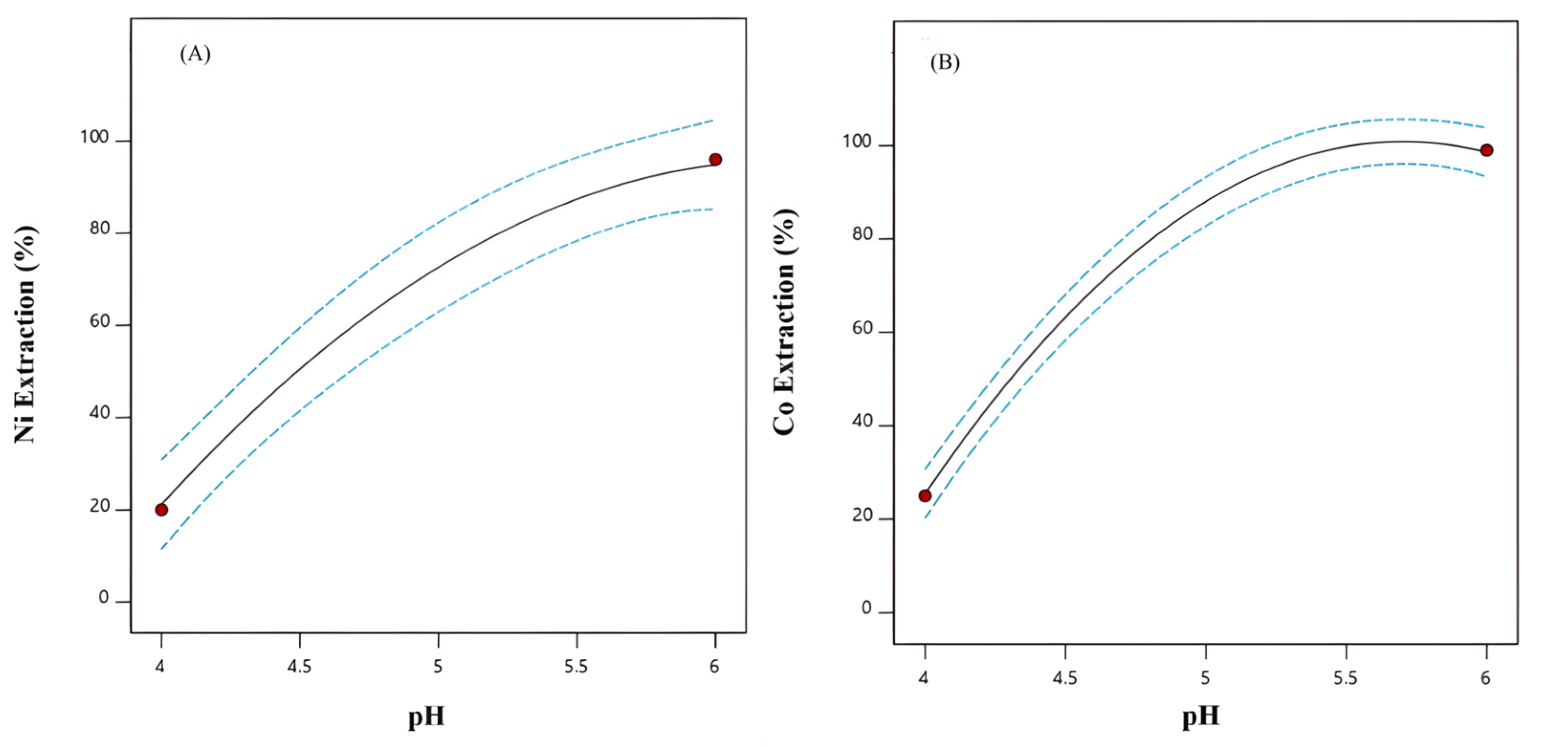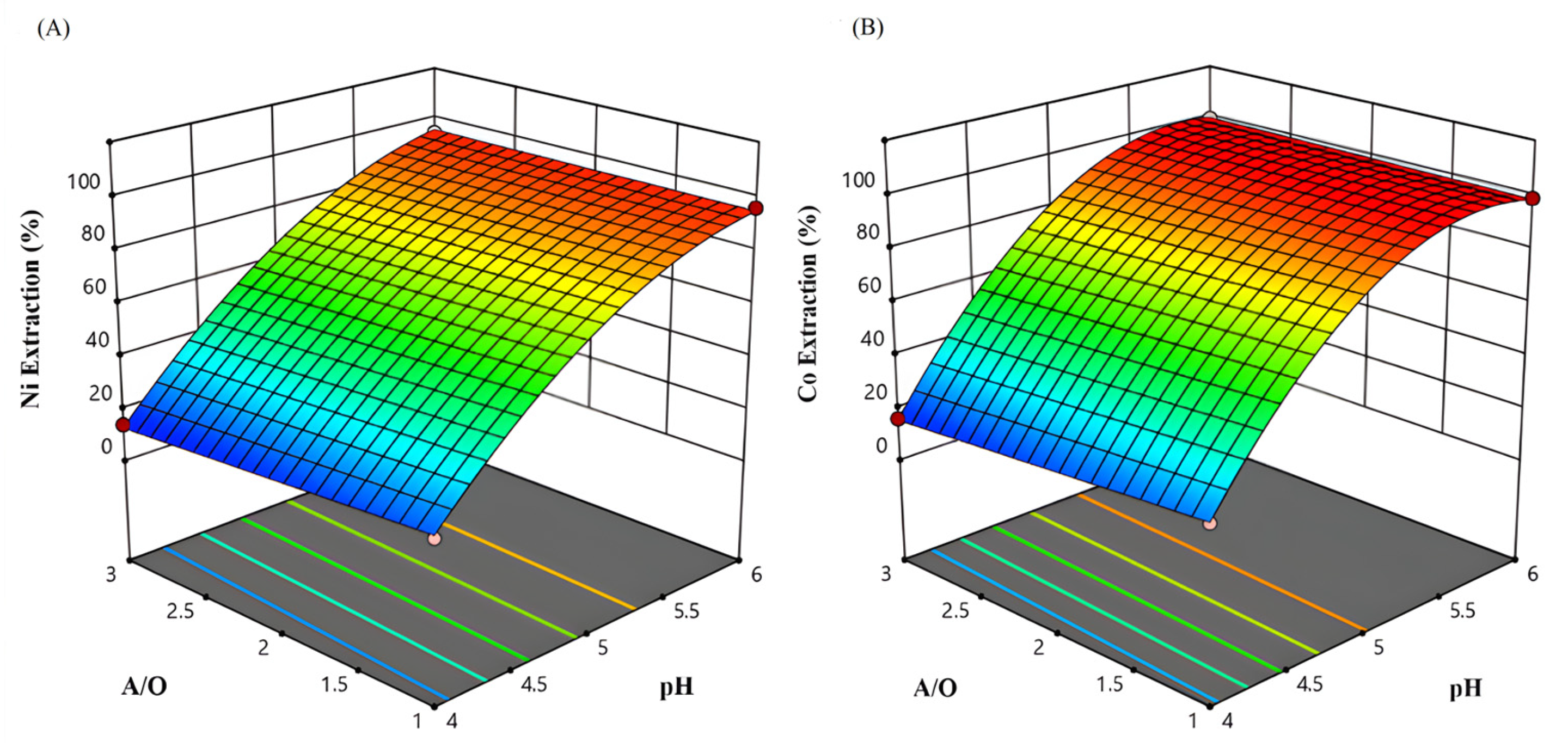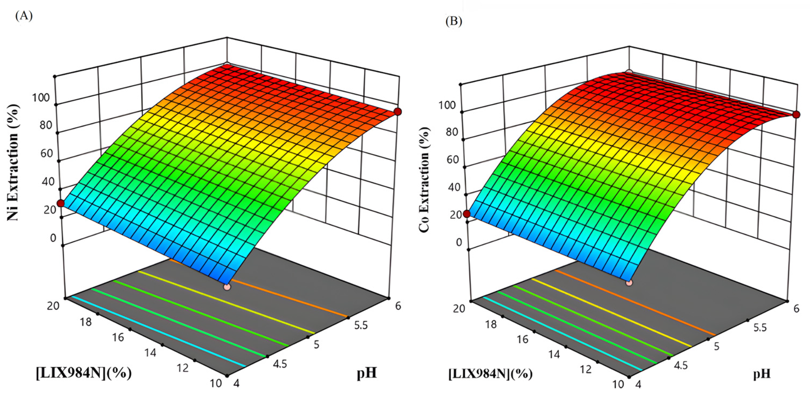3.3. Synergistic Effect of the Studied Parameters on Nickel and Cobalt Extraction Using LIX984N
