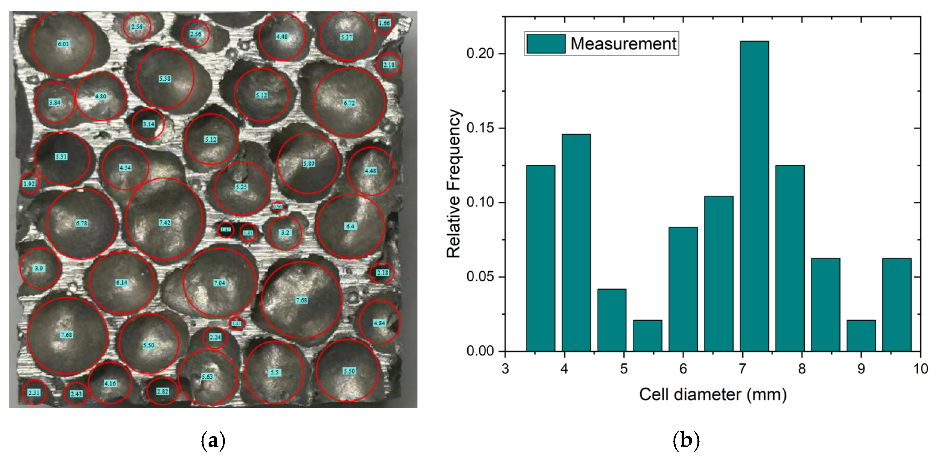 - Xiao, Y.; Liu, H.; Dong, X.; Fan, C.; Zou, Y.; Han, Y.; Sun, Y. Effect of cell diameter variations on the mechanical behavior of aluminum foams: Experiments and modeling. Mater. Today Commun. 2024, 3, 109090. [Google Scholar] [CrossRef]