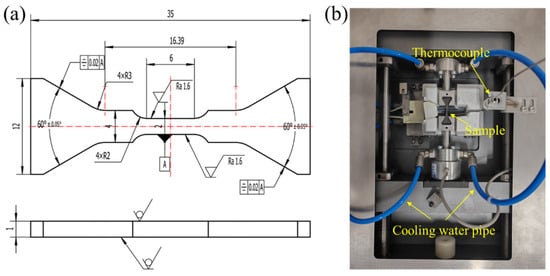 (a) Geometric Dimensions of In Situ cyclic loading Specimen (unit: mm, letter A is the tolerance); (b) In Situ cyclic loading Testing Setup.