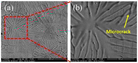 Figure 2 shows the surface morphology of the galvanized coating obtained from the high-Si steel substrate. The coating exhibits distinct spangle structures with grain radii of approximately 300–350 μm, indicating strong dependence of Zn solidification behavior on local substrate composition. At higher magnification (Figure 2b), multiple microcracks are observed within the coating surface, typically located at grain boundaries or between spangle regions. These cracks reflect mechanical mismatches between solidified Zn and underlying intermetallic layers, and they correspond well to the crack features noted during galvanizing.