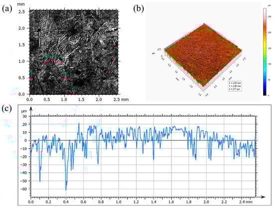 Confocal Characterization of Zn Coating: (a) Microscopic Morphology; (b) Three-Dimensional Topography; (c) Line-Scanning Profile.