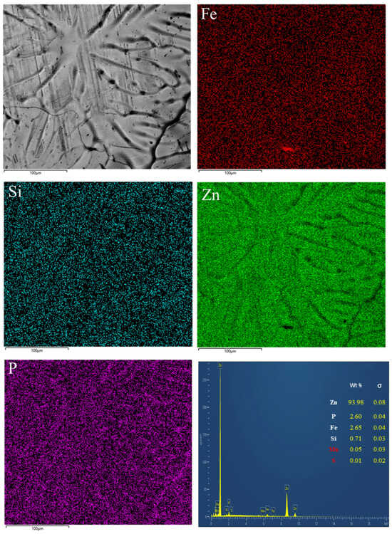 Figure 4 presents the surface elemental distribution of the coating. Zn is uniformly distributed across the surface, while localized enrichment of P is observed within surface depressions. The P originates from substrate impurities or trace bath components and tends to accumulate at regions where Zn wetting or Fe-Zn reactions were hindered.