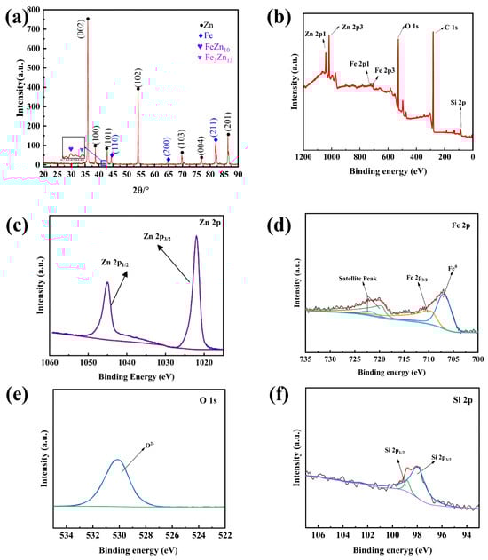 Analysis of Phase Composition and Elemental Valence States in Zn Coating. (a) XRD pattern; (b) XPS survey spectrum; (c) Zn 2p spectrum; (d) Fe 2p spectrum; (e) O 1s spectrum; (f) Si 2p spectrum.