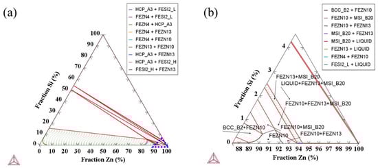 Fe-Zn-Si Ternary Phase Diagram at 460 °C. (a) Isothermal section of the Fe-Zn-Si ternary system; (b) Magnified view of the low-Si region within the dotted triangular area in (a).