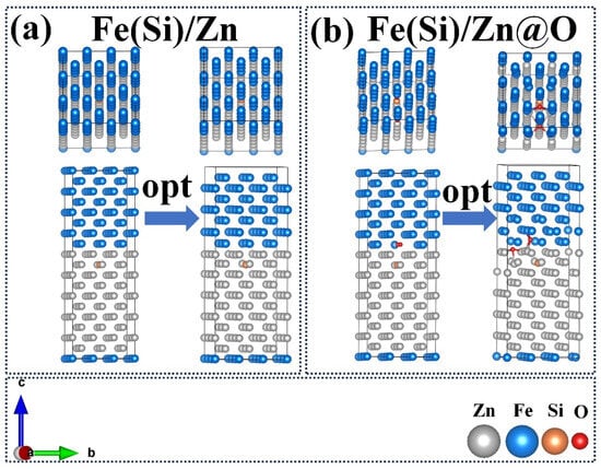 Top/Front Views of Interface Structure Models and Geometric Optimization Models. (a) Fe(Si)/Zn interface structure; (b) Fe(Si)/Zn@O interface structure.
