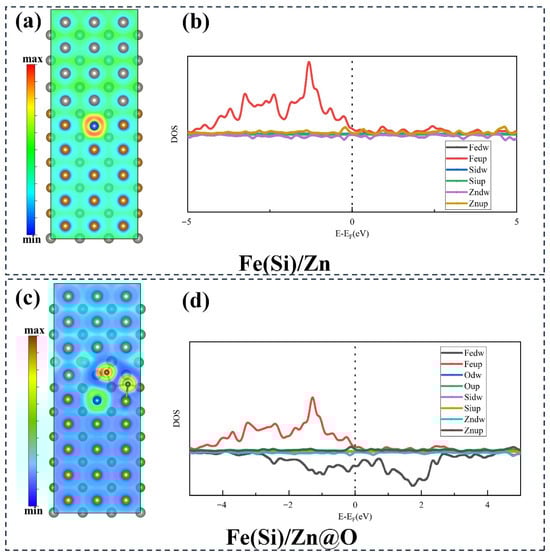 Electron Localization Function and Partial Density of States of Interface Structure Models. (a,b) Fe(Si)/Zn interface structure; (c,d) Fe(Si)/Zn@O interface structure.