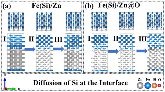 Diffusion of Si in Two Interface Structures. (a) Fe(Si)/Zn interface structure; (b) Fe(Si)/Zn@O interface structure (I, II, III denote initial diffusion state, transition state, and terminal state, respectively).