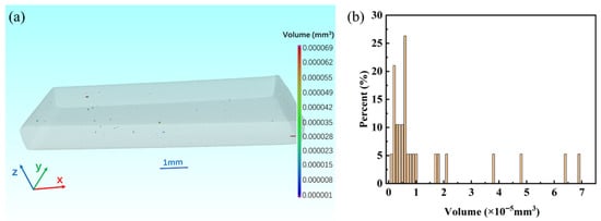 CT-Based Defect Analysis of Zn Coating. (a) Three-dimensional defect distribution in the coating sample; (b) Volume fraction of three-dimensional defects in the coating sample.