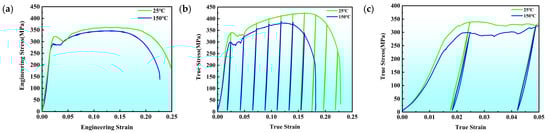 Engineering stress–strain curves (Figure 13a and Table 1) show that at 150 °C, the coated steel exhibits reduced yield strength, tensile strength, and elongation compared with room temperature, demonstrating classical thermal softening behavior. Load–unload–reload results (Figure 13b,c) reveal pronounced hysteresis loops at 25 °C, indicating significant back-stress hardening produced by constraints between the coating and substrate. At 150 °C, these hysteresis loops diminish due to increased atomic mobility, decreased interfacial strength, and reduced dislocation storage.