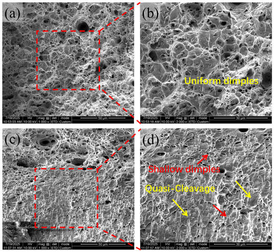 Tensile Fracture Morphologies at Different Temperatures. (a) 25 °C; (b) Magnified view of boxed region in (a); (c) 150 °C; (d) Magnified view of boxed region in (c).