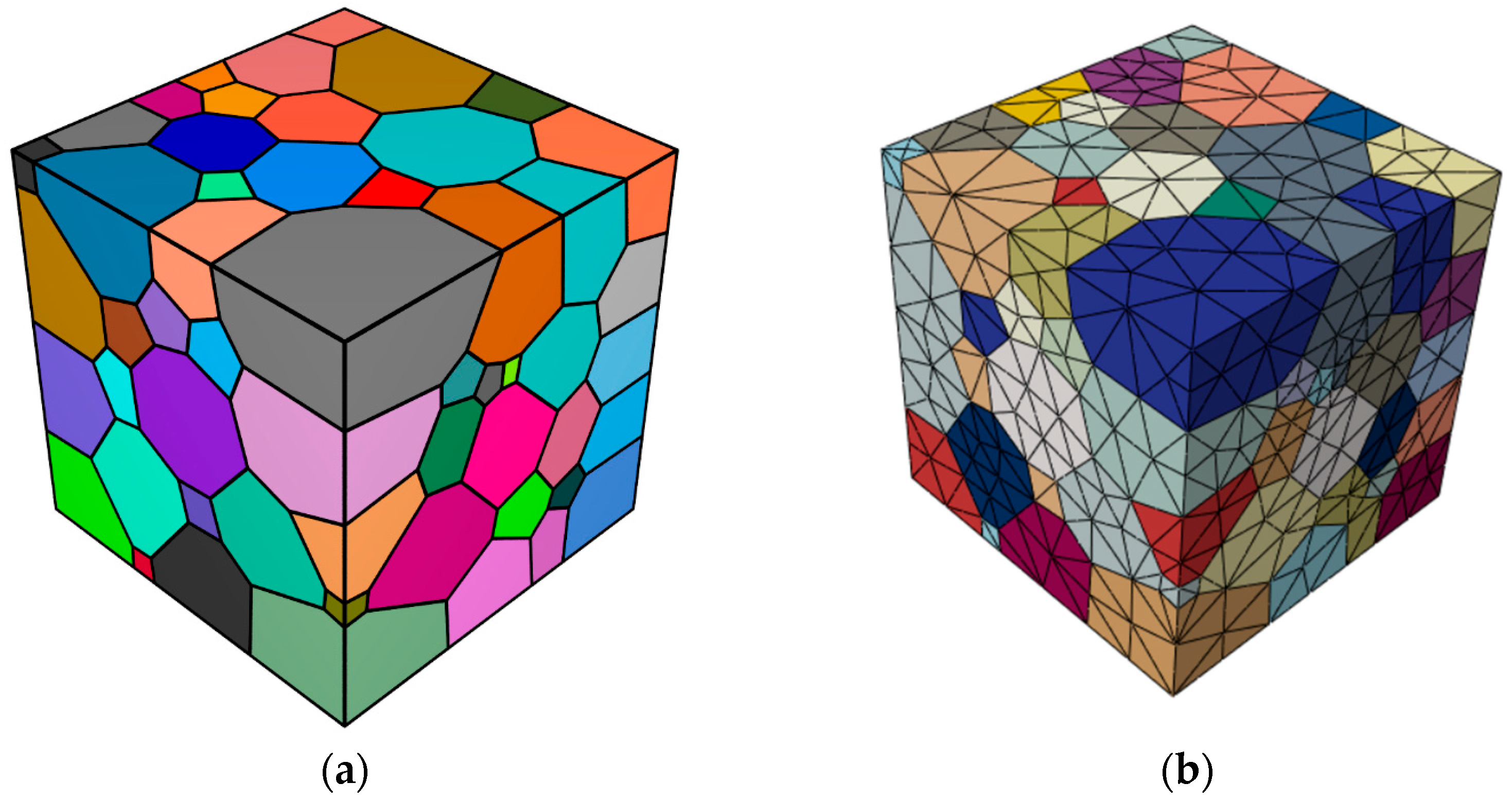 - Quey, R.; Dawson, P.R.; Barbe, F. Large-Scale 3D Random Polycrystals for the Finite Element Method: Generation, Meshing and Remeshing. Comput. Methods Appl. Mech. Eng. 2011, 200, 1729–1745. [Google Scholar] [CrossRef]