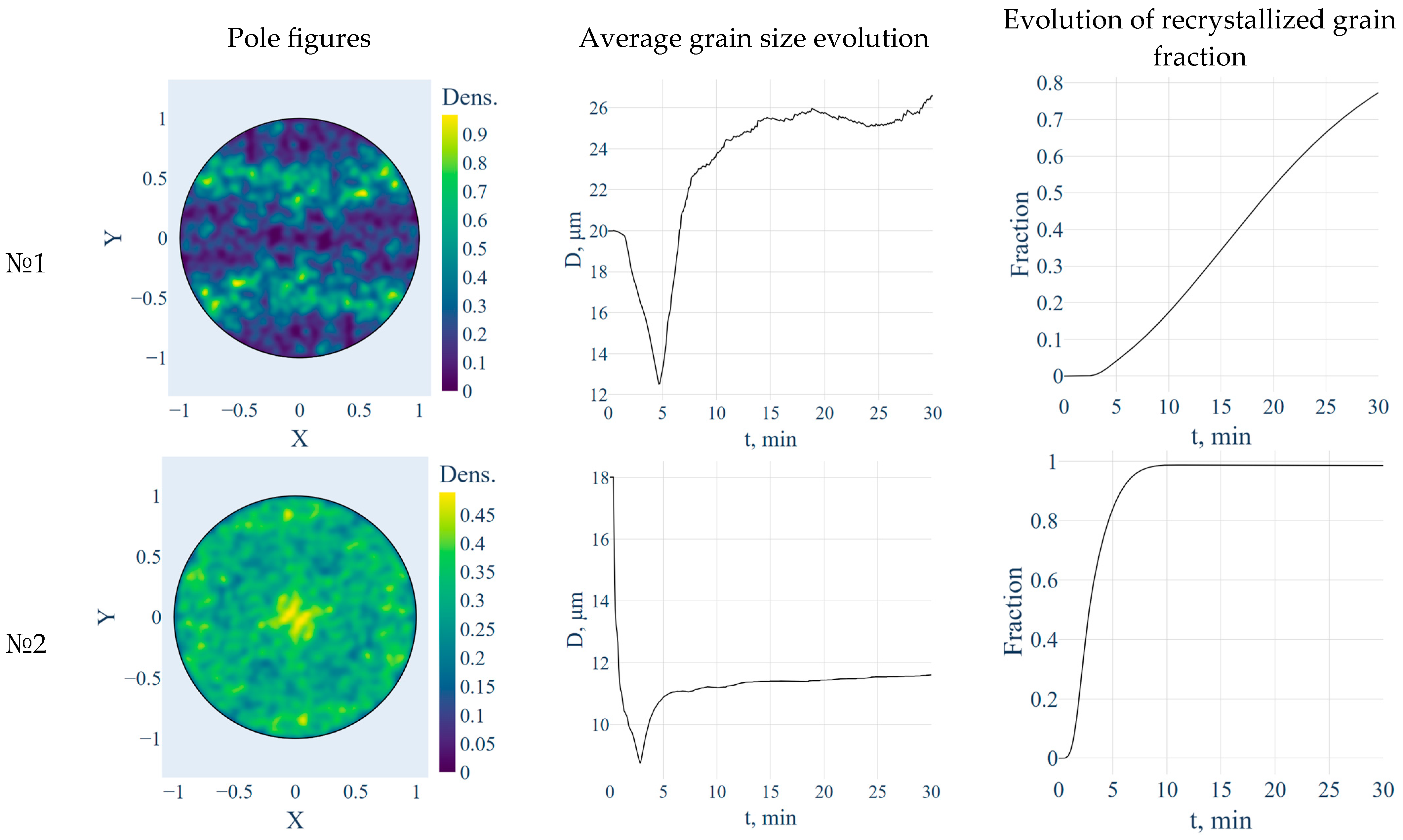 - Trusov, P.V.; Kondratyev, N.S. Two-Level Elastoviscoplastic Model: An Application to the Analysis of Grain Structure Evolution under Static Recrystallization. Phys. Mesomech. 2019, 22, 230–241. [Google Scholar] [CrossRef]