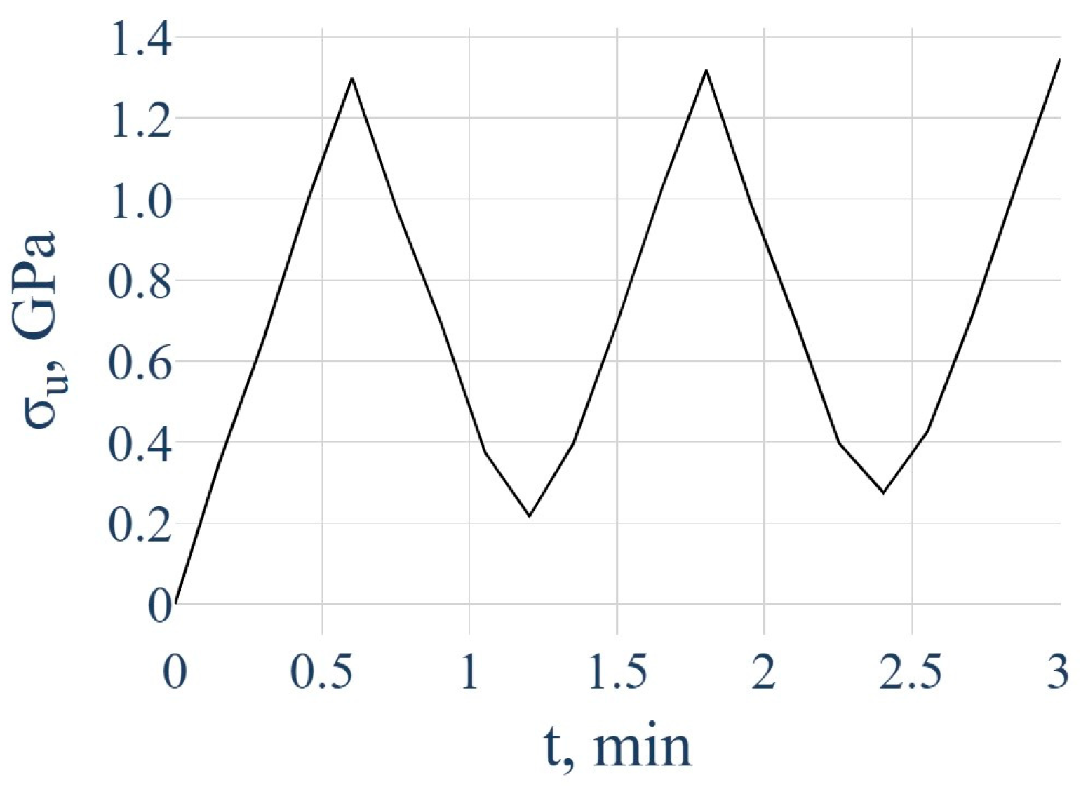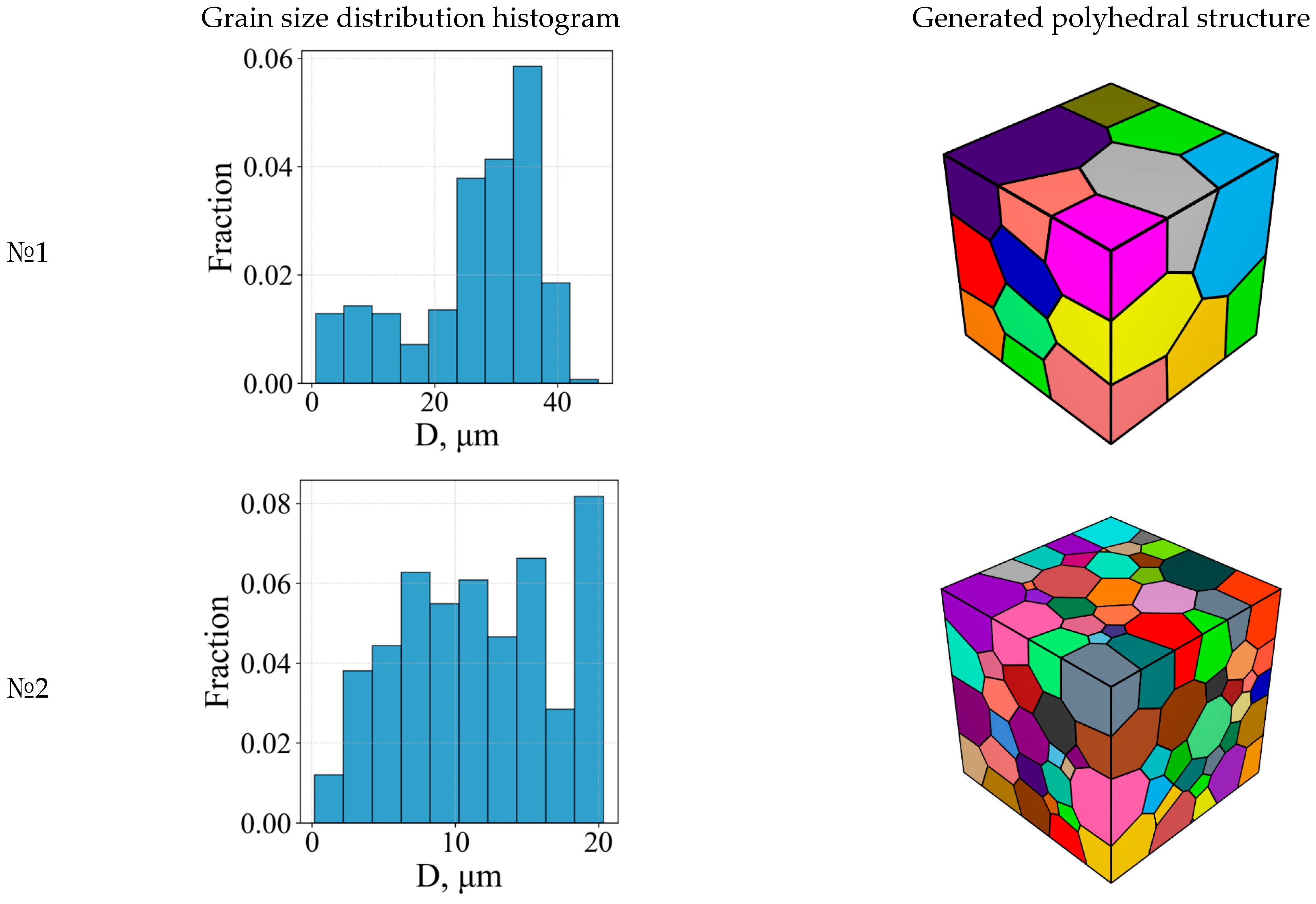- To directly model operational impacts, the geometric characteristics of the grain structure were derived from statistical computational results. Based on these results, a polyhedral grain structure was generated using the Neper 4.8.2 software package. The resulting topology was imported into Abaqus to simulate cyclic operational loads. A detailed model that accounts for the actual shape of grains and their spatial arrangement demonstrated its high accuracy in predicting the material behavior under cyclic uniaxial tension and compression.