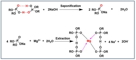 Acidic organophosphorus extractants have long been crucial reagents in the separation of metal ions. Their extraction mechanism is generally governed by an interfacial cation exchange mechanism, which enables the selective transfer of divalent cations. The extraction kinetics are influenced by both the solution pH and the hydration energy of the target metal ions. Yu et al. [] used P204 as an extractant to selectively separate Mg2+ from other metal ions and demonstrated that two P204 molecules coordinate with a single Mg2+ ion to form a stable complex (see Figure 5). Shi et al. [] further investigated the extraction behavior of P204 towards Ca2+, Mg2+, and Li+, revealing the following selectivity order: H+ > Ca2+ > Mg2+ > Li+ > Na+. This finding indicates that P204 preferentially forms complexes with protons over other metal ions. In systems containing multiple cations, particularly Ca2+ and Mg2+, which have a higher charge density and a lower hydration radius, the behavior of these competing ions has a strong influence on the extraction of Li+. Their preferential coordination with organophosphorus ligands or proton substitution can significantly suppress the transfer of Li+ into the organic phase. Consequently, the presence of high concentrations of Ca2+ and Mg2+ in brine reduces the extraction efficiency of Li+ and alters the equilibrium distribution and interfacial reaction dynamics. Following saponification with NaOH, P204 is converted to its sodium salt, significantly enhancing the selectivity of the extraction system. Using a three-stage counter-current extraction process, Ca2+ and Mg2+ were efficiently removed with removal efficiencies of 99.05% and 98.48%, respectively. Residual Li+ entrapped in the organic phase was minimized by washing with dilute hydrochloric acid to reduce the loss of lithium. Subsequent adjustment of the HCl concentration enabled the effective stripping and recovery of Ca2+ and Mg2+.