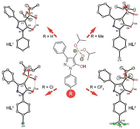 Zhang et al. [] synthesized a series of novel 4-phosphorylpyrazolone extractants that demonstrated pronounced lithium recognition and extraction capabilities. Single-crystal X-ray diffraction revealed that bimetallic lithium complexes were formed in the presence of TBP, TBPO, or acetonitrile, whereas a unique trinuclear lithium complex with a tetrahedral [Li3O] core was obtained in the TOPO system. NMR and mass spectrometry confirmed the existence of multinuclear complexes in the organic phase and revealed dynamic aggregation–dissociation behavior. Building on this work, Zhang et al. [] modified the 4-phosphorylpyrazolone framework by introducing electron-donating, electron-withdrawing, or neutral substituents at the para-position of the benzene ring (see Figure 8). Experimental results showed that electron-withdrawing groups increased the acidity of the extractant, weakened the O–H bond, and thereby enhanced lithium extraction. Competitive extraction experiments at varying pH values revealed sequential extraction behavior: at pH = 2, Ca2+ was preferentially extracted with minor Mg2+ extraction; at pH = 3, Mg2+ extraction predominated with limited Li+ uptake; and as the pH increased from 5 to 6, lithium extraction rose from 77% to 94%, while Na+ and K+ remained largely unextracted. This stepwise separation strategy offers a promising pathway for lithium recovery from acidic brines and leachates of spent lithium-ion batteries.