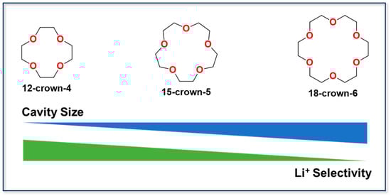Typical crown ethers and their size-dependent Li+ selectivity.