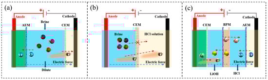 (a) Electrodialysis system; (b) Li+-selective membrane electrodialysis system; (c) bipolar membrane electrodialysis system.
