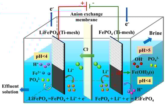 Schematic diagram of lithium extraction mechanism by electrochemical method (electrode LiFePO4/FePO4). Reprinted from ref. [].