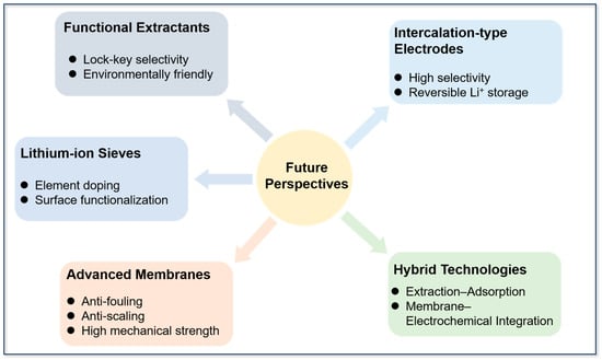 Future research directions may be as follows (see Figure 15): Firstly, the rational design and development of new functional extractants with specific identification ability, controllable cost, and environmental friendliness should be prioritized. Particular focus should be placed on developing highly selective extractants with a ‘lock-key’ effect for Li+, such as hydrophobic diketo extractants, deep eutectic solvents, functionalized ionic liquids, coronoid ether derivatives, and polydentate ligands. Secondly, element doping (e.g., W, Zr, Ce, Co, and B) and surface functionalization should be employed to reinforce the structural stability, anti-deactivation capacity, and Li+ selectivity of lithium-ion sieves under high salinity conditions, thereby enabling their efficient cyclic use. Thirdly, developing advanced membranes that have superior anti-fouling and anti-scaling properties, an extended lifetime, and high mechanical strength is essential to enhance the separation efficiency of nanofiltration and electrodialysis in complex brine systems and facilitate their integration into scalable processes. Fourthly, designing novel intercalation-type electrode materials that exhibit high selectivity, structural durability, and reversible Li+ storage capacity will be crucial for improving electrochemical methods.