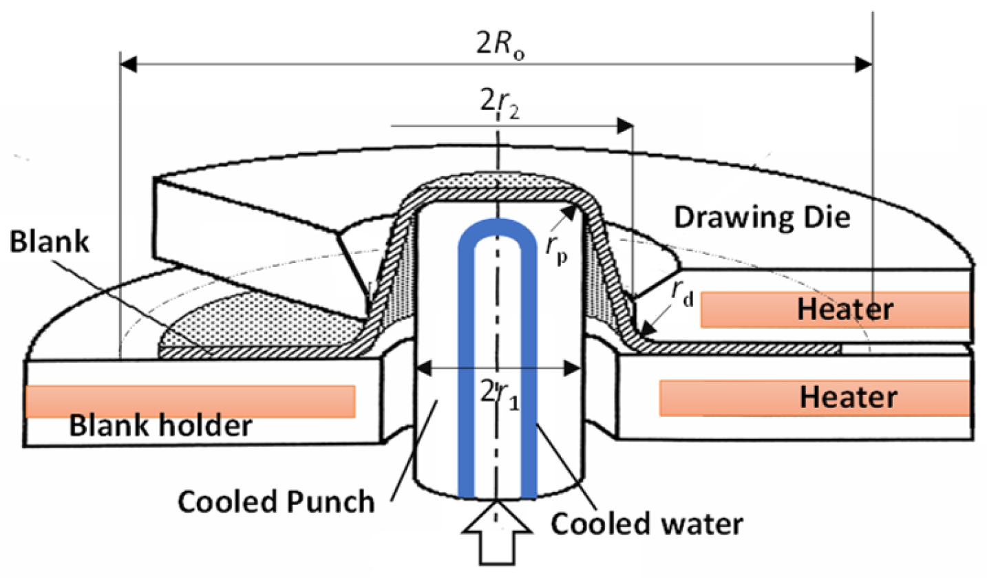 - Kim, H.S.; Koç, M.; Ni, J. Development of an analytical model for warm deep drawing of aluminum alloys. J. Materi. Process. Technol. 2008, 197, 393–407. [Google Scholar] [CrossRef]