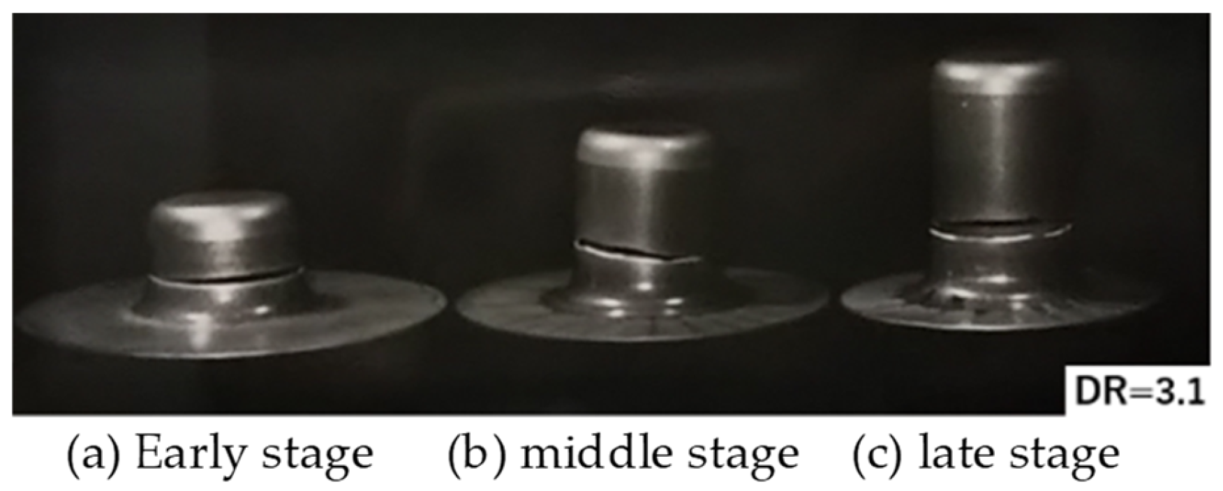 - Yagami, T.; Manabe, K. FE analysis on deformation mechanism of strain-rate-sensitive materials in cylindrical deep-drawing with combination punch speed and blank holder control. J. Solid Mech. Mater. Eng. 2007, 1, 1385–1396. [Google Scholar] [CrossRef]