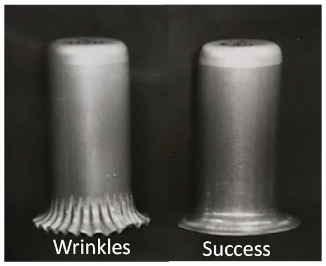 - Watanabe, Y. Warm deep drawing method of stainless steel sheet. J. JSTP 1992, 37, 396–403. [Google Scholar]