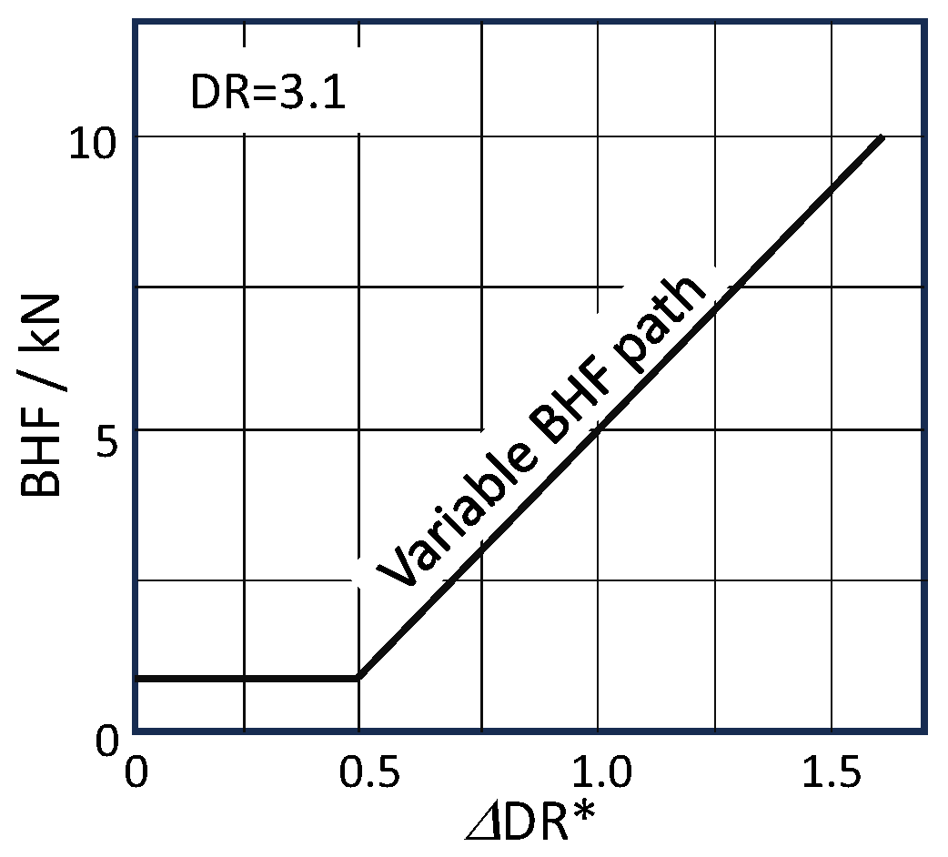 - Manabe, K.; Hamano, H.; Nishimura, H. A new variable blank holding force method in deep drawing of sheet materials. J. JSTP 1988, 29, 740–747. [Google Scholar]