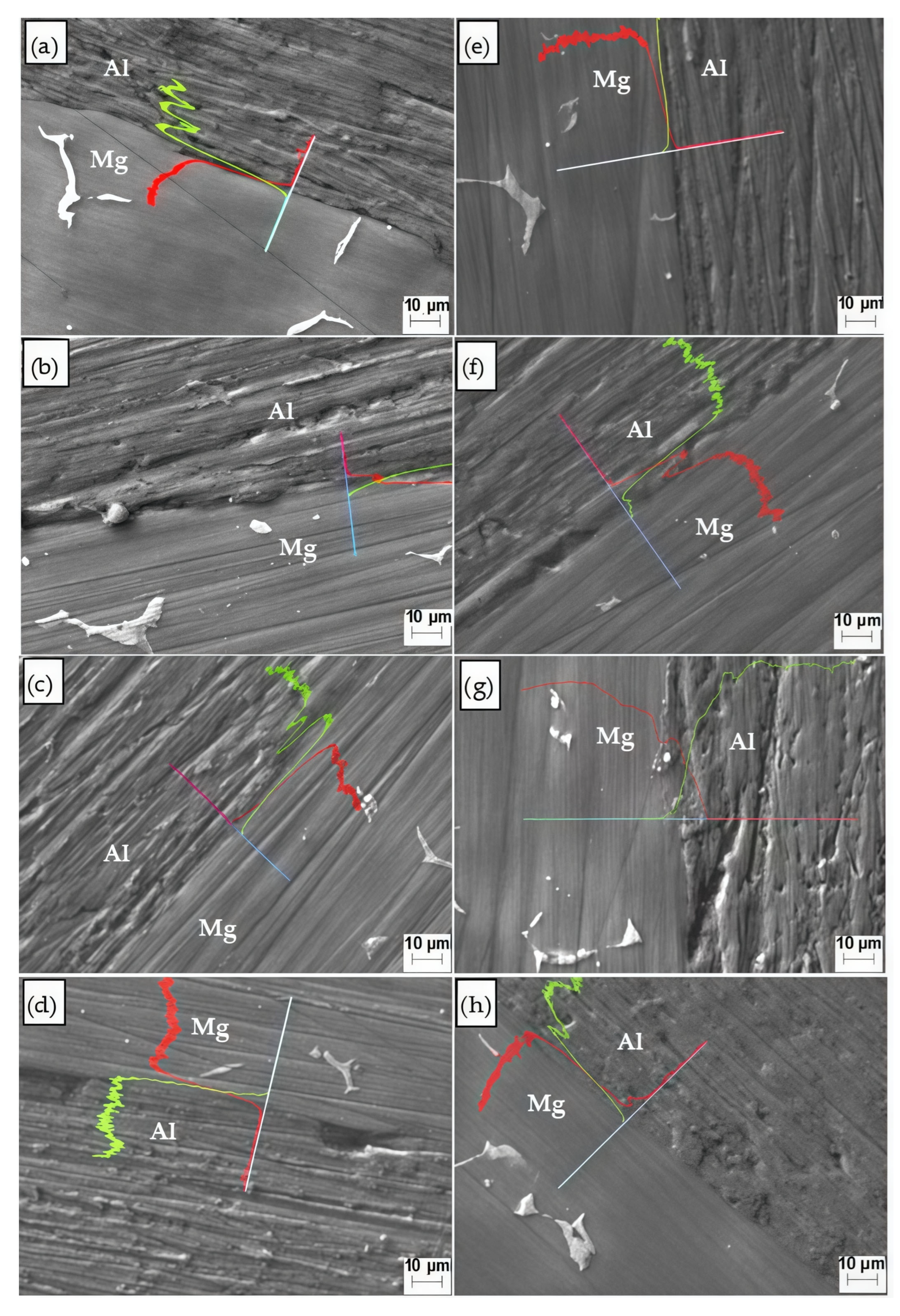 As seen in Figure 5c,d, the diffusion in the interface is not quite evident at the temperature of 200 °C, even if the heat-treating time is prolonged to 4 h. Thus, for the diffusion, the samples heat-treated at 250 °C should be focused on. The diffusion behaviors of Mg and Al elements can be seen in Figure 5f,g, representing the MPWed samples heat-treated at 250 °C for 2 h and 4 h, respectively. As the diffusion frontiers of both Al and Mg elements are concerned, the total width of the Mg/Al interface in the sample heat-treated at 250 °C for 2 h is about 15 μm, between the positions of (A) and (E), seen in Figure 5f. When the heat-treating time increased to 4 h, seen in Figure 5g, the width is enhanced to ~20 μm, ranging from the position (F) to the position (I). In the Mg/Al interface of the sample heat-treated at 250 °C for 4 h, the Al peak is ~7 μm away from the Mg frontier in the Al side. While in the sample for 4 h, the distance between the Al peak and the Mg frontier is about 16 μm, roughly twice of that in the sample for 2 h. It is obvious that the diffusion of Mg/Al interface in samples heat-treated at 250 °C shows an increase when increasing the heat-treating time.