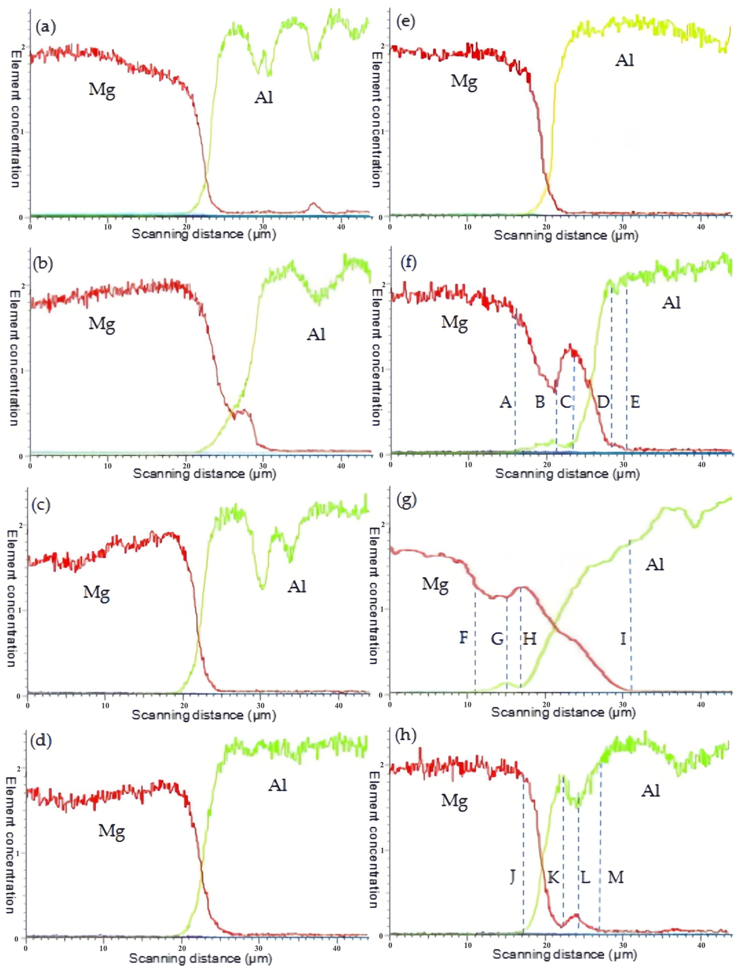 Figure 5. EDS line scanning results of Mg/Al interfaces in the (a) as-MPWed, (b) 200 °C × 1 h, (c) 200 °C × 2 h, (d) 200 °C × 4 h, (e) 250 °C × 1 h, (f) 250 °C × 2 h and (g) 250 °C × 4 h samples, and (h) 250 °C × 4 h sample with precipitates ahead of EDS scanning line.