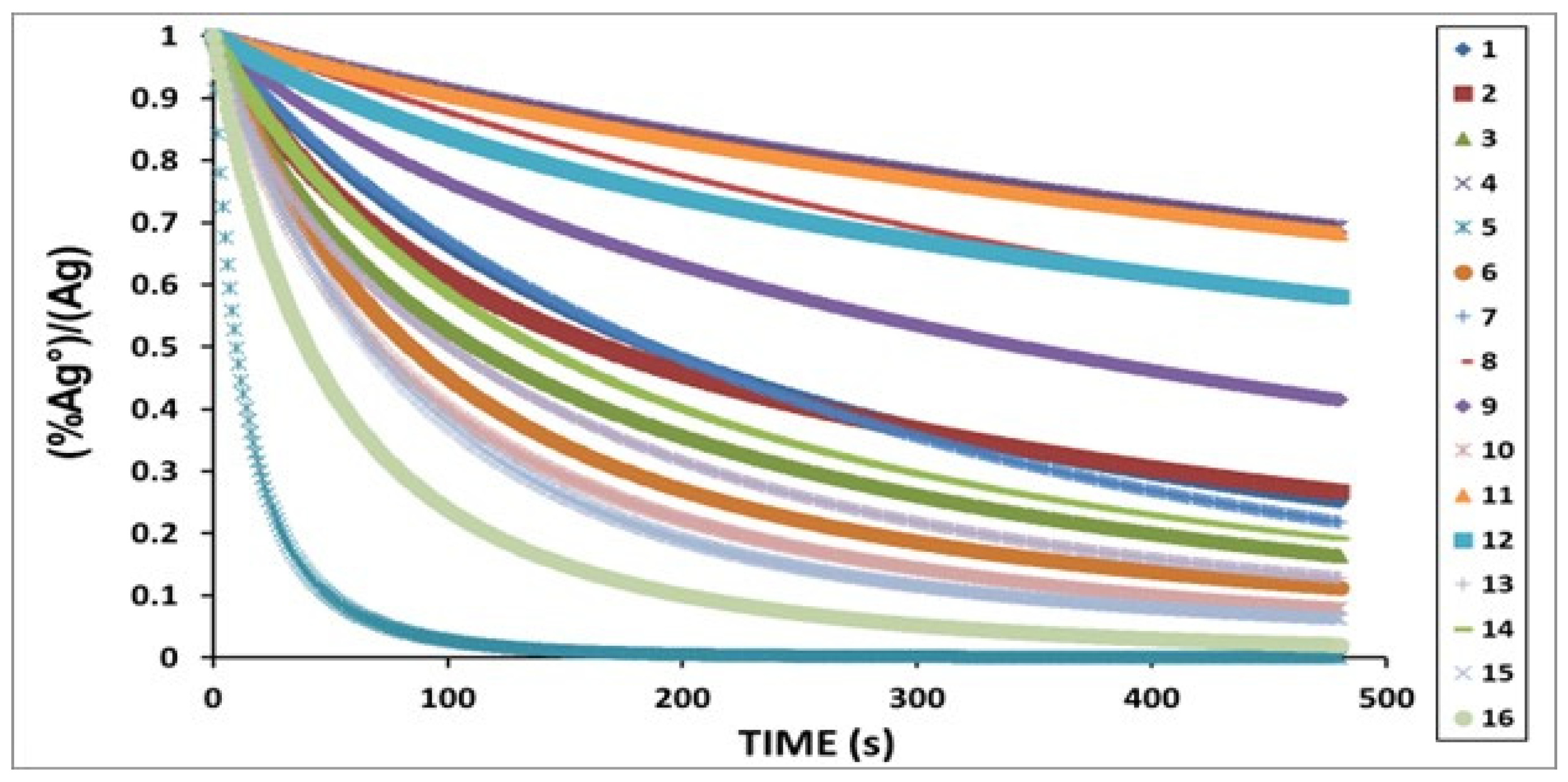| Condition | Desilvering Fraction | Residence Time (s) | Mixing Time (s) | ke | E |