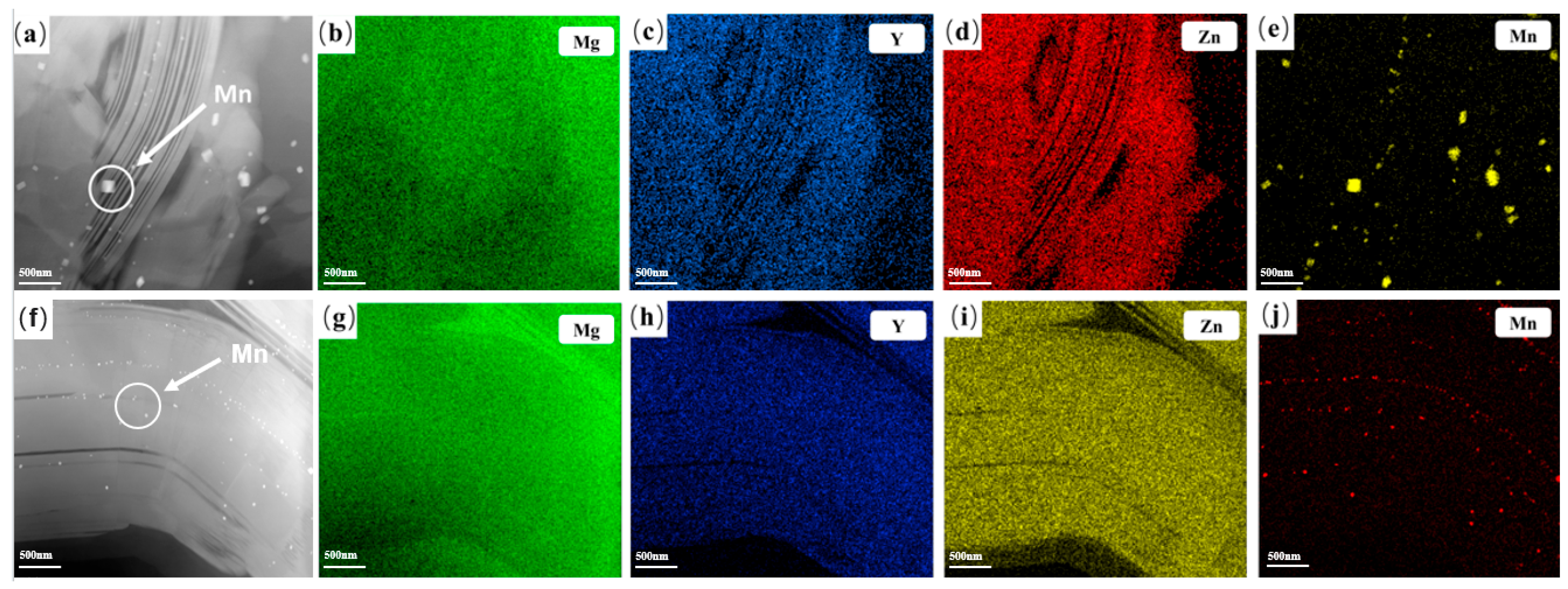- The Mn particles pinned in the 18R-LPSO phase as an obstacle to dislocation may reduce the stacking fault energy of the system and make it more stable, which enhances the thermal stability of the 18R-LPSO phase, thereby enhancing the stability of the alloy at elevated temperature.