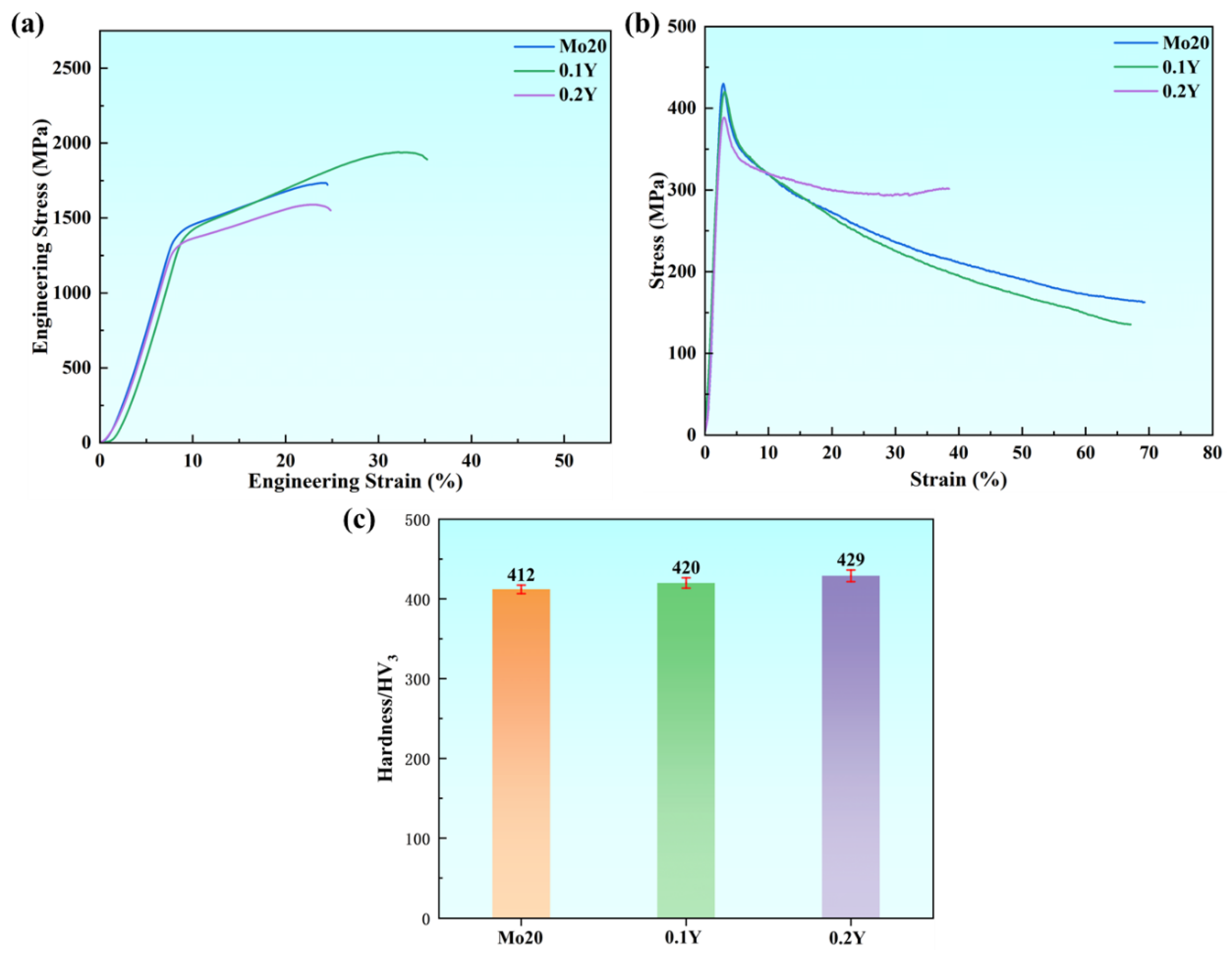 - With the increase in Mo element content, the solid solution strengthening effect of RHEAs enhances. Lattice distortion can impede dislocation movement, and its strength increases significantly in high-temperature environments. The room-temperature yield strength and high-temperature yield strength of Mo20 have increased by 35.1% and 227.5%, respectively, compared with Mo10. The high-temperature yield strength has increased significantly. However, its plasticity decreases, and the plasticity can be further improved by adding rare earth Y.