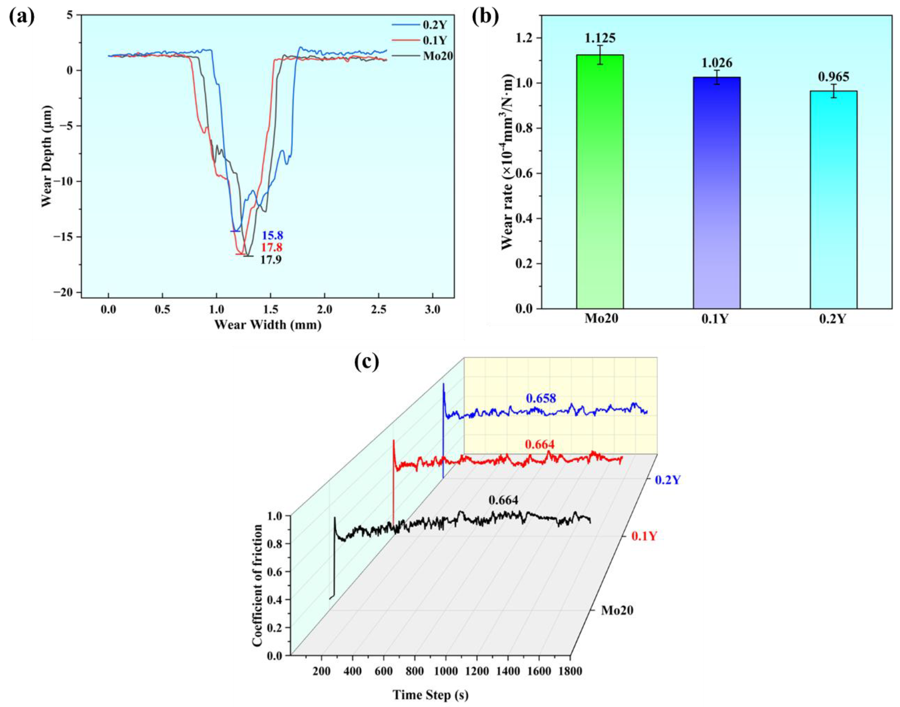 - Incorporating an optimal amount of rare earth Y facilitates grain refinement and solid solution strengthening. With the incorporation of rare earth Y, the average grain size of Mo20 decreased from 131.5 μm to 54.5 μm. Moreover, the hardness and wear resistance of Mo20 also increase with the addition of Y.