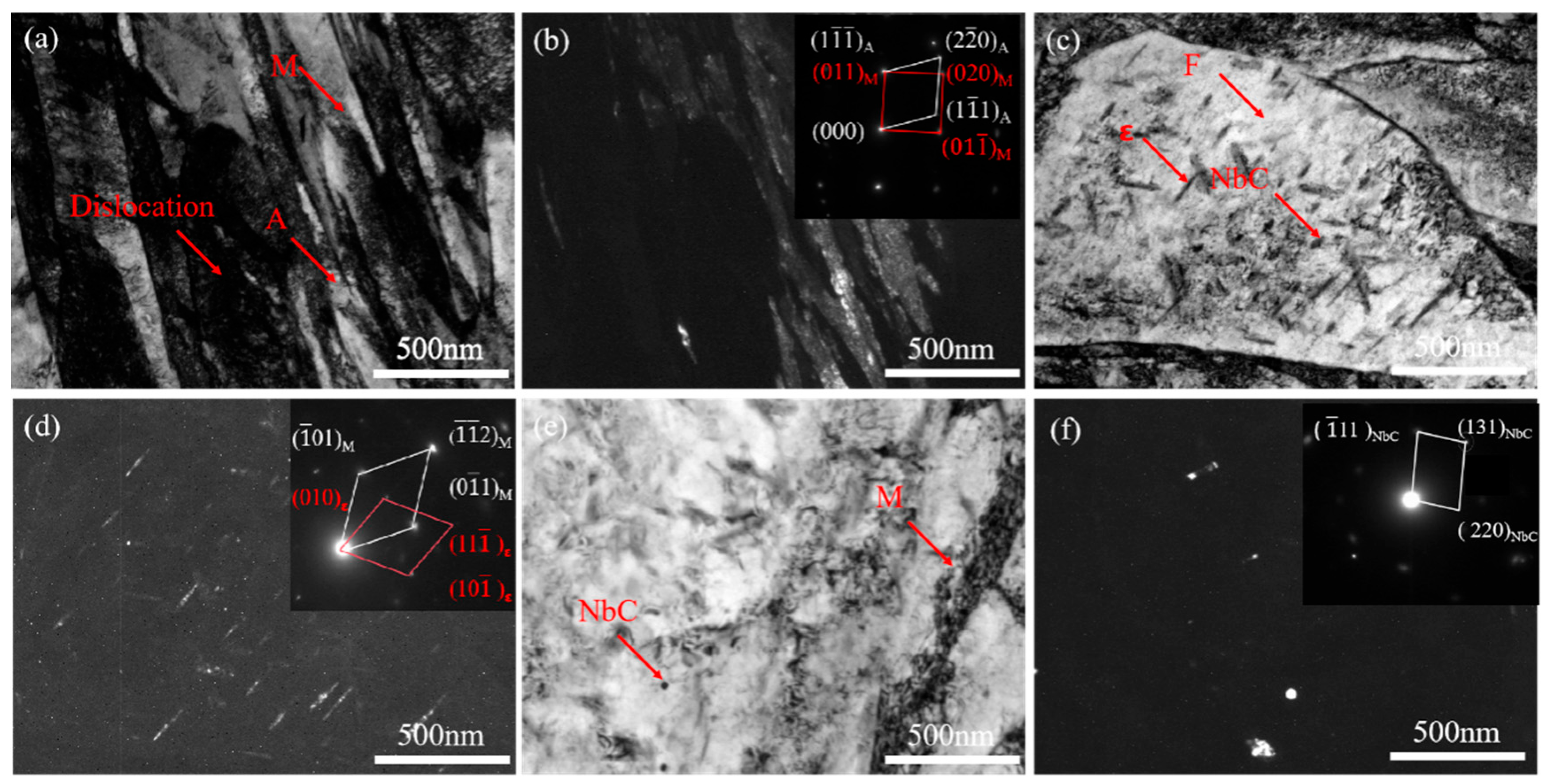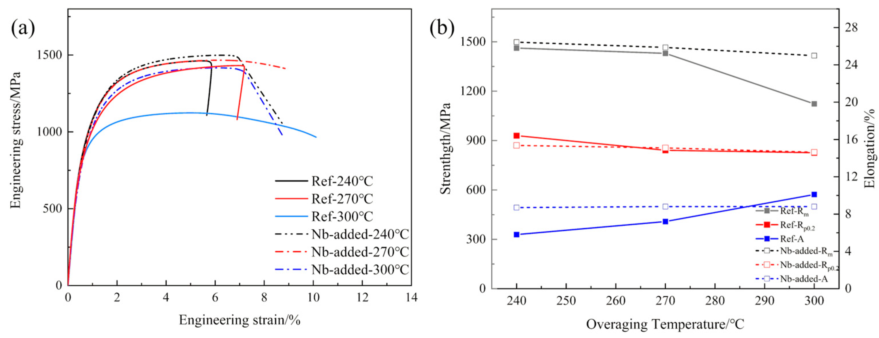 - Increasing the over-aging temperature promotes martensite decomposition and carbide precipitation, resulting in blurred martensite morphology, an increased fraction of quenched martensite, and the stabilization of retained austenite. The addition of Nb significantly refines the microstructure, including prior austenite grains, martensite laths, and ferrite, thereby enhancing microstructural homogeneity.