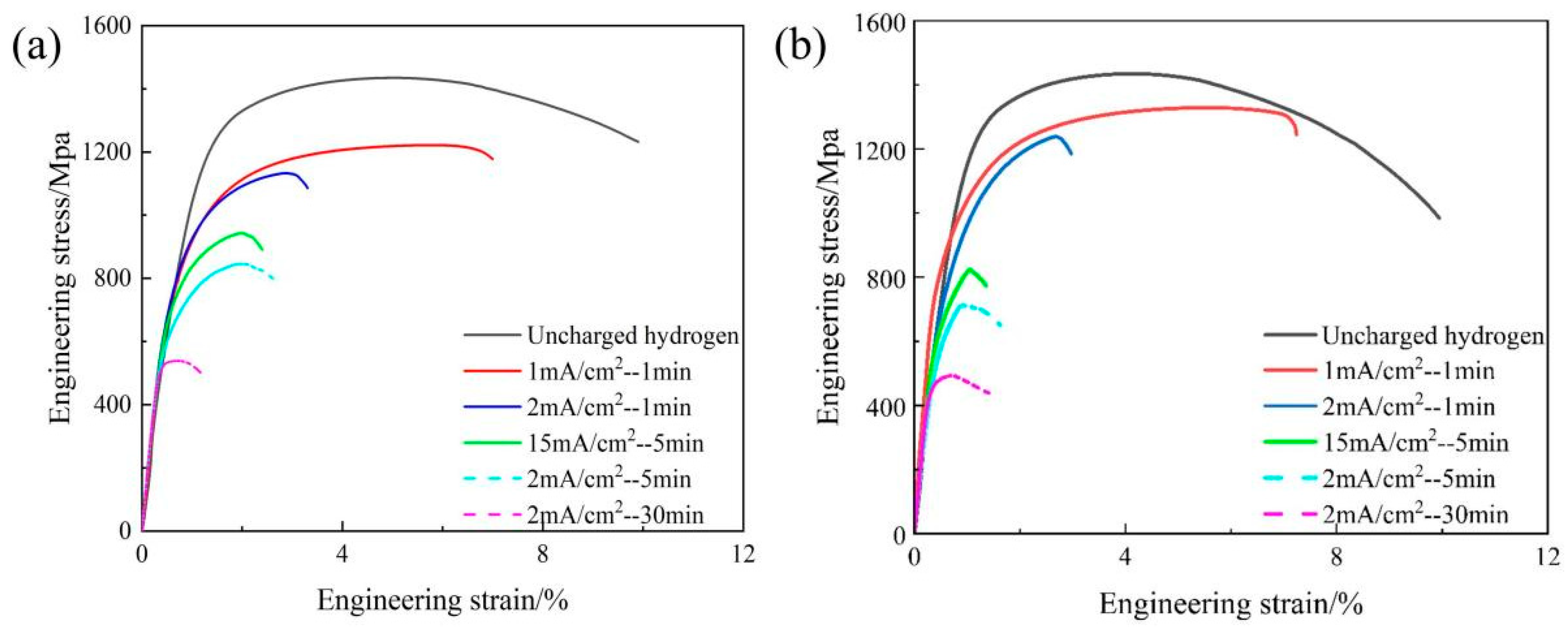 | Hydrogen Charging Current Density (mA/cm2) | Hydrogen Charging Time (min) | Rm (MPa) | Rp0.2 (MPa) | A (%) | Elloss (%) | |