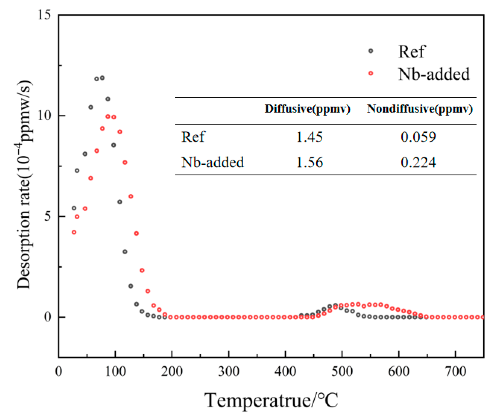 - The superior HE resistance of Nb-added steel is attributed to the irreversible hydrogen trapping capability of nano-sized NbC precipitates. While these precipitates increase the total hydrogen content, they effectively reduce mobile hydrogen diffusivity and prevent detrimental hydrogen accumulation at critical microstructural interfaces, thereby mitigating hydrogen-induced degradation.