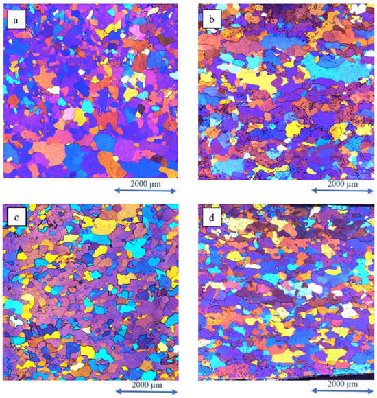 The experiment utilizes an aluminum cylinder with a diameter of 76 mm and a purity of 99.999 percent, supplied by the HMW Hauner company (Röttenbach, Germany). Figure 1 presents the microstructure of the as-received cylinder in both transverse and longitudinal sections, examined at the center and near the surface, using light microscopy combined with color etching. Cylindrical samples, oriented parallel to the original cylinder, are machined with a length of 10 mm and a diameter of 5 mm. Subsequently, the samples undergo deformation at three distinct initial strain rates: 1, 0.1, and 0.01 s−1. The compression tests are performed at temperatures of −196 °C, −50 °C, 30 °C, 100 °C. 300 °C and 500 °C. Liquid nitrogen and a mixture of acetone and dry ice are used to achieve temperatures of −196 °C and −50 °C, respectively. Due to practical limitations, the compression test at −196 °C and 0.01 s−1 has not been carried out. The cooling liquids are applied directly to the samples during the course of the tests. The dilatometer DIL 805 A/D, manufactured by Baehr (Hüllhorst, Germany), is utilized, with graphite employed as a lubricant to avert barreling.