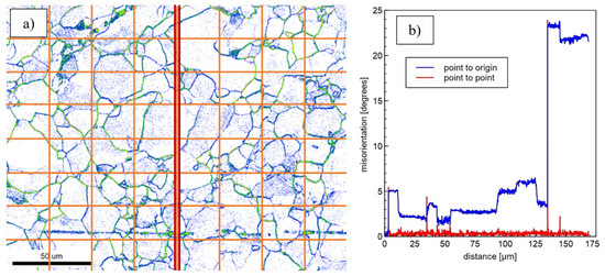 The subgrain/cell size is determined using a variant of the line intercept method, adapted to misorientation data obtained from EBSD measurements. In this approach, peaks in both point-to-point and point-to-origin misorientation angles along predefined scan lines are analyzed to identify subgrain/cell boundaries. The use of both misorientation types is crucial: while point-to-point misorientation is effective in detecting abrupt orientation changes indicative of subgrain/cell walls, point-to-origin misorientation helps reveal gradual orientation changes that may not be captured by point-to-point analysis alone. This combined analysis improves the reliability of boundary detection. For each scanned area, seven horizontal and seven vertical lines are evaluated. The presence of misorientation jumps or inflection points in the profile indicates the position of subgrain/cell walls, and the subgrain/cell size is determined by averaging the distances between these features. As illustrated in Figure 2a, the grid of the specimen deformed at 300 °C to 0.47 strain is presented. Figure 2b details the misorientation angles for the central vertical line.