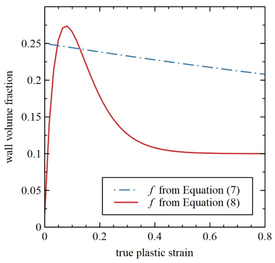 where is the peak value of , the saturation value of and is a parameter, which determines the decrease rate of . Equation (7) is particularly useful at large strains. To verify the presented model, in addition to the aforementioned equation, another equation is presented below to estimate the wall volume fraction. As demonstrated in refs. [56,57], the value of escalates rapidly at the onset of plastic deformation, subsequently decreasing to a saturated state. We approximate these values with the following empirical relation