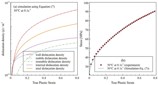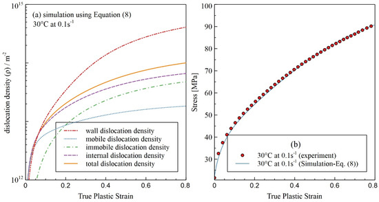 (a) Evolution of dislocation densities using Equation (8) and (b) comparison of flow curves achieved from simulation and experimental compression test for specimen deformation by 0.1 s−1 at 30 °C.