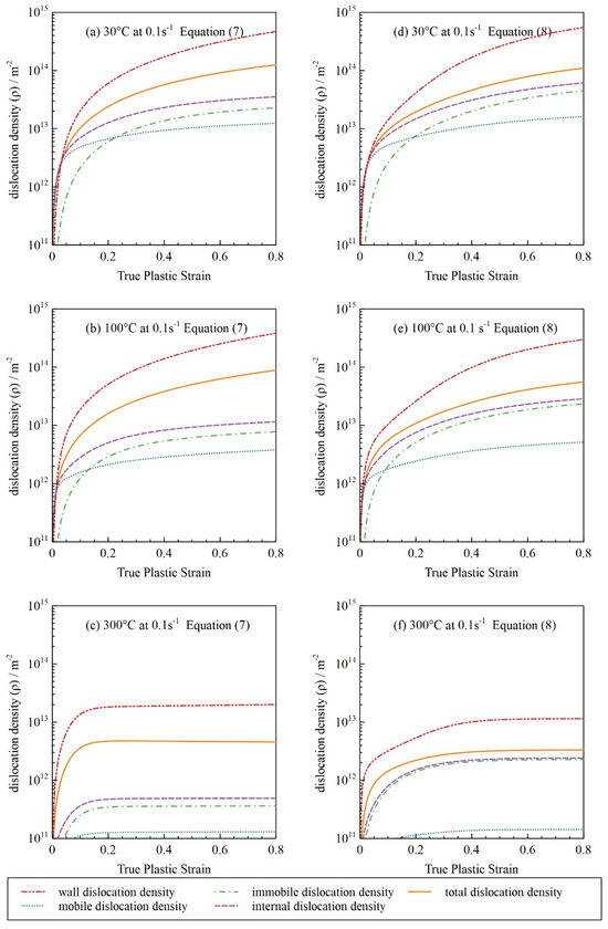 Evolution of dislocation densities during deformation at a strain rate of 0.1 s−1, simulated using Equation (7) for (a) 30 °C, (b) 100 °C, and (c) 300 °C, and using Equation (8) for (d) 30 °C, (e) 100 °C, and (f) 300 °C.