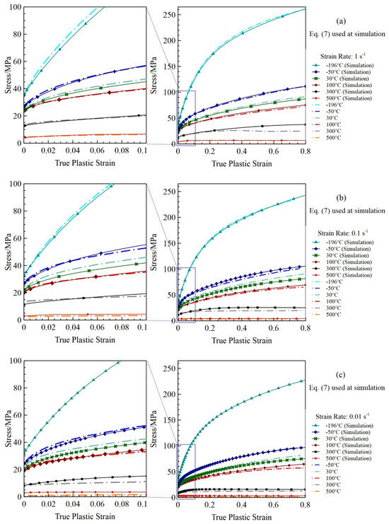 Comparison of flow curves from simulation (Equation (8)) and experimental data for strain rates of (a) 1 s−1 (b) 0.1 s−1 and (c) 0.01 s−1.