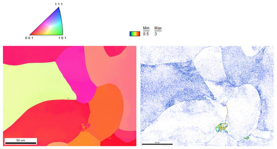 The inverse pole figure (IPF) map of the transverse cross-section (perpendicular to the cylinder axis) for the as-received (undeformed) state sample is presented in Figure 10. Each color corresponds to a specific crystallographic orientation relative to the sample reference frame. In this work, the compression direction (parallel to the cylinder axis) is the sample reference frame. The IPF triangle color key corresponds to the crystallographic directions. The KAM of as-received sample is provided to ensure that the samples are in the state of low dislocation density before deformation.