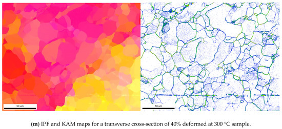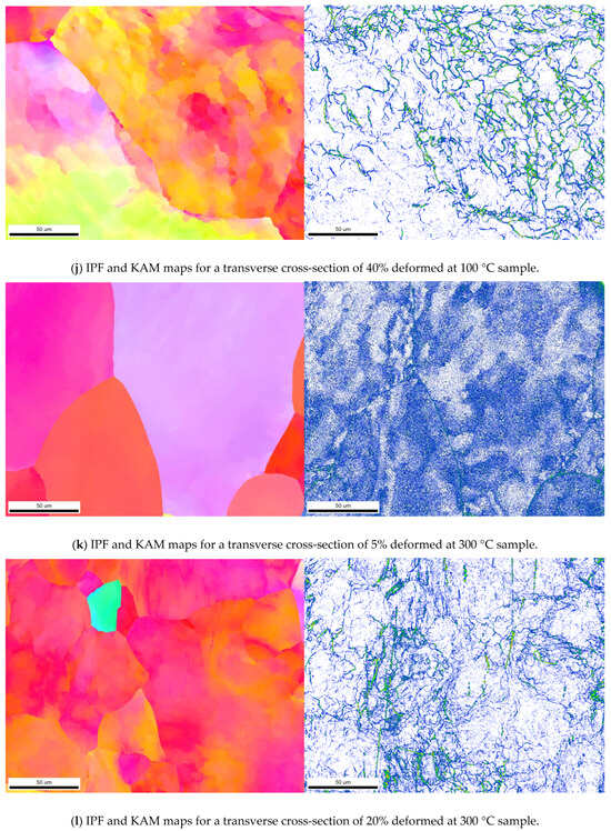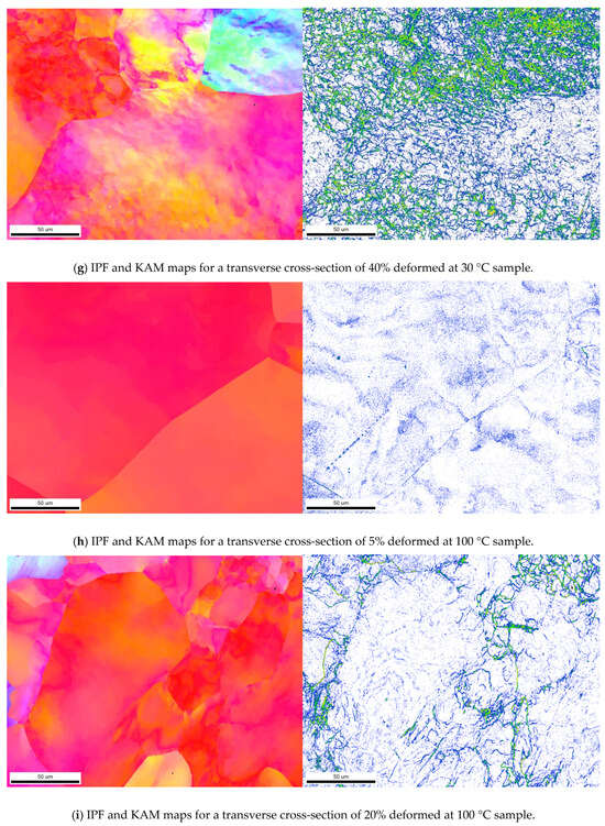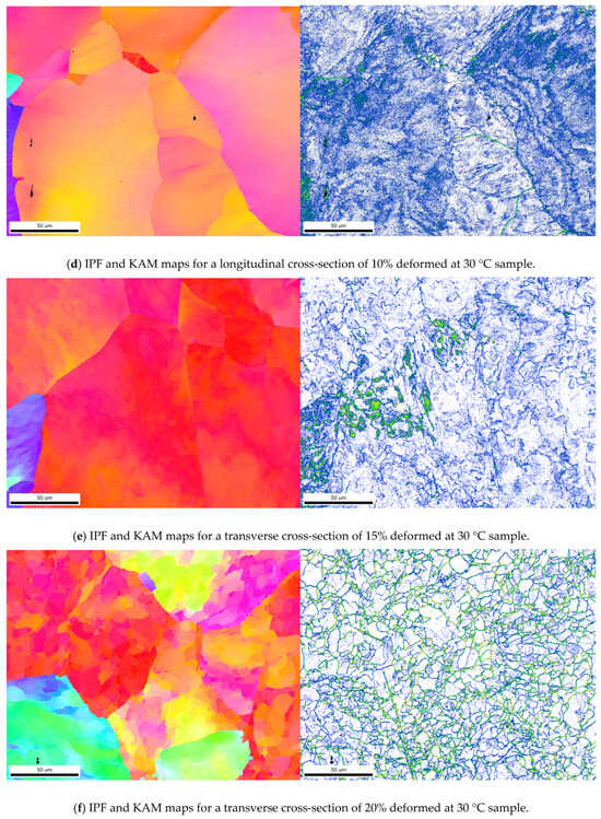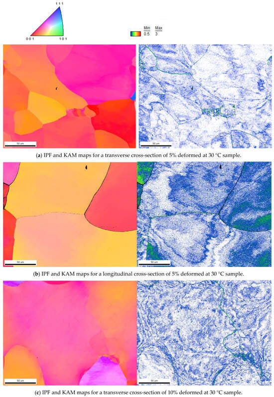 The IPF maps of the transverse cross-sections for each sample are shown in Figure 11. For the specimens deformed to 5% and 10% strain at 30 °C, the longitudinal cross-sections are also included. The corresponding KAM maps, calculated based on the third nearest neighbors, are provided alongside the IPF maps. While the average misorientation angle can increase up to 3 degrees during deformation [69], the KAM values are constrained to the range of 0.5–3° in order to better highlight intragranular misorientation and the formation of subgrains/cells.